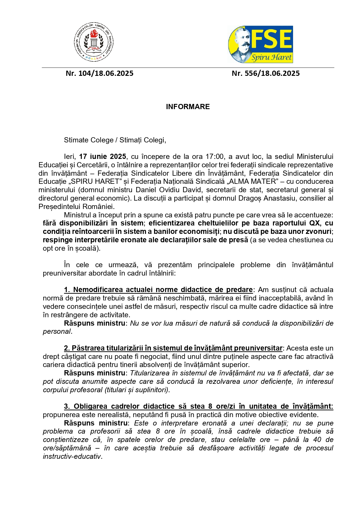 „Ieri, 17 iunie 2025, cu începere de la ora 17:00, a avut loc, la sediul Ministerului Educației și Cercetării, o întâlnire a reprezentanților celor trei federații sindicale reprezentative din învățământ – Federația Sindicatelor Libere din Învățământ, Federația Sindicatelor din Educație „SPIRU HARET” și Federația Națională Sindicală „ALMA MATER” – cu conducerea ministerului (domnul ministru Daniel Ovidiu David, secretarii de stat, secretarul general și directorul general economic). La discuții a participat și domnul Dragoș Anastasiu, consilier al Președintelui României”, se arată în informarea sindicatelor.