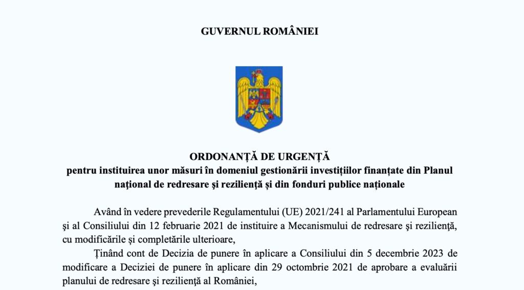 - Mecanism de excepție: Se instituie un mecanism special pentru proiectele urgente, necesare pentru îndeplinirea jaloanelor din PNRR agreate cu Comisia Europeană.