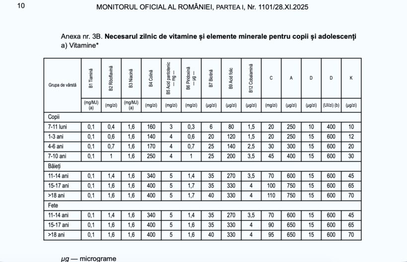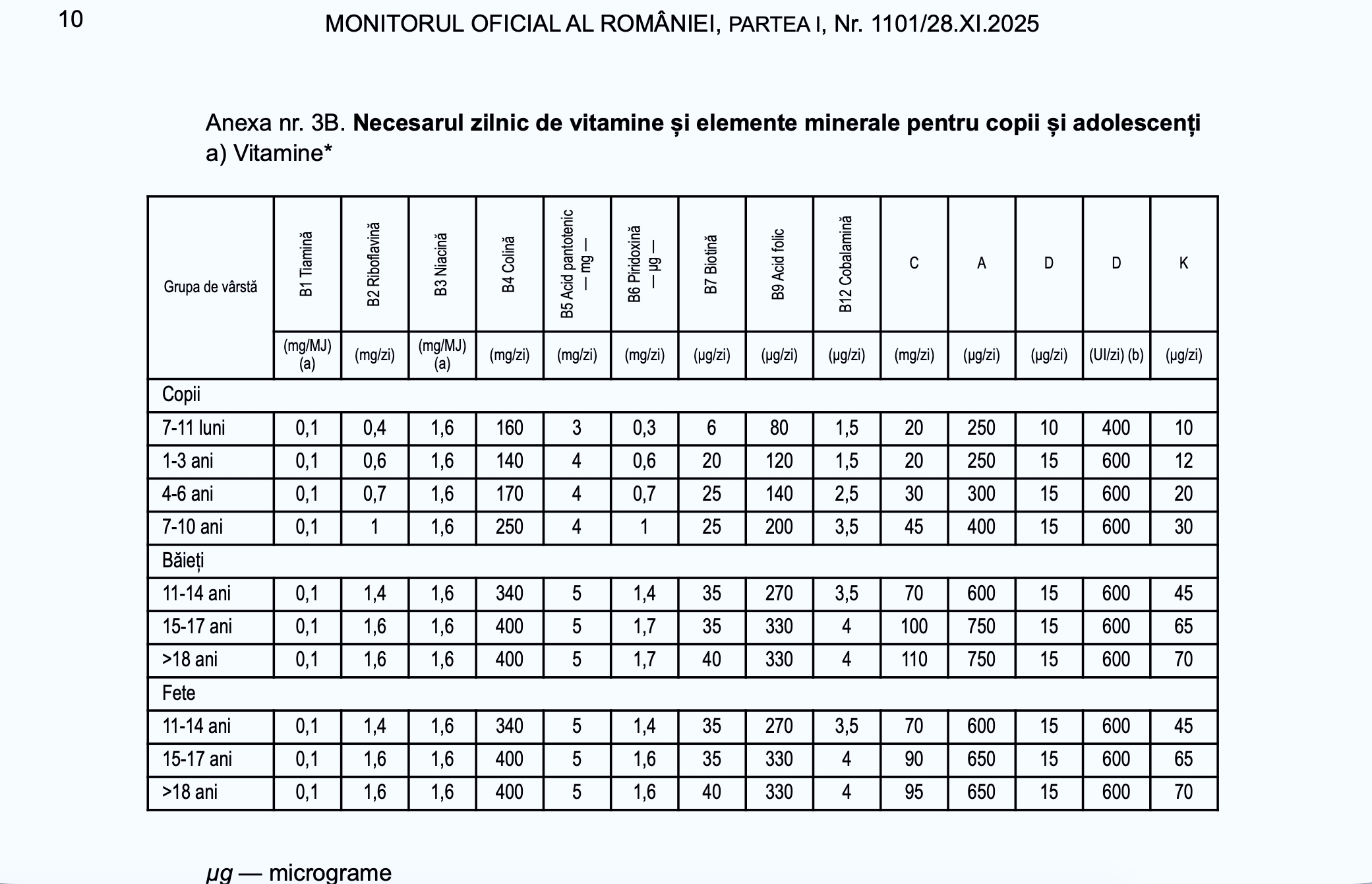 Necesarul zilnic de vitamine și elemente minerale pentru copii și adolescenți – Ordin nr 1.582 Ministerul Sănătății / Monitorul Oficial