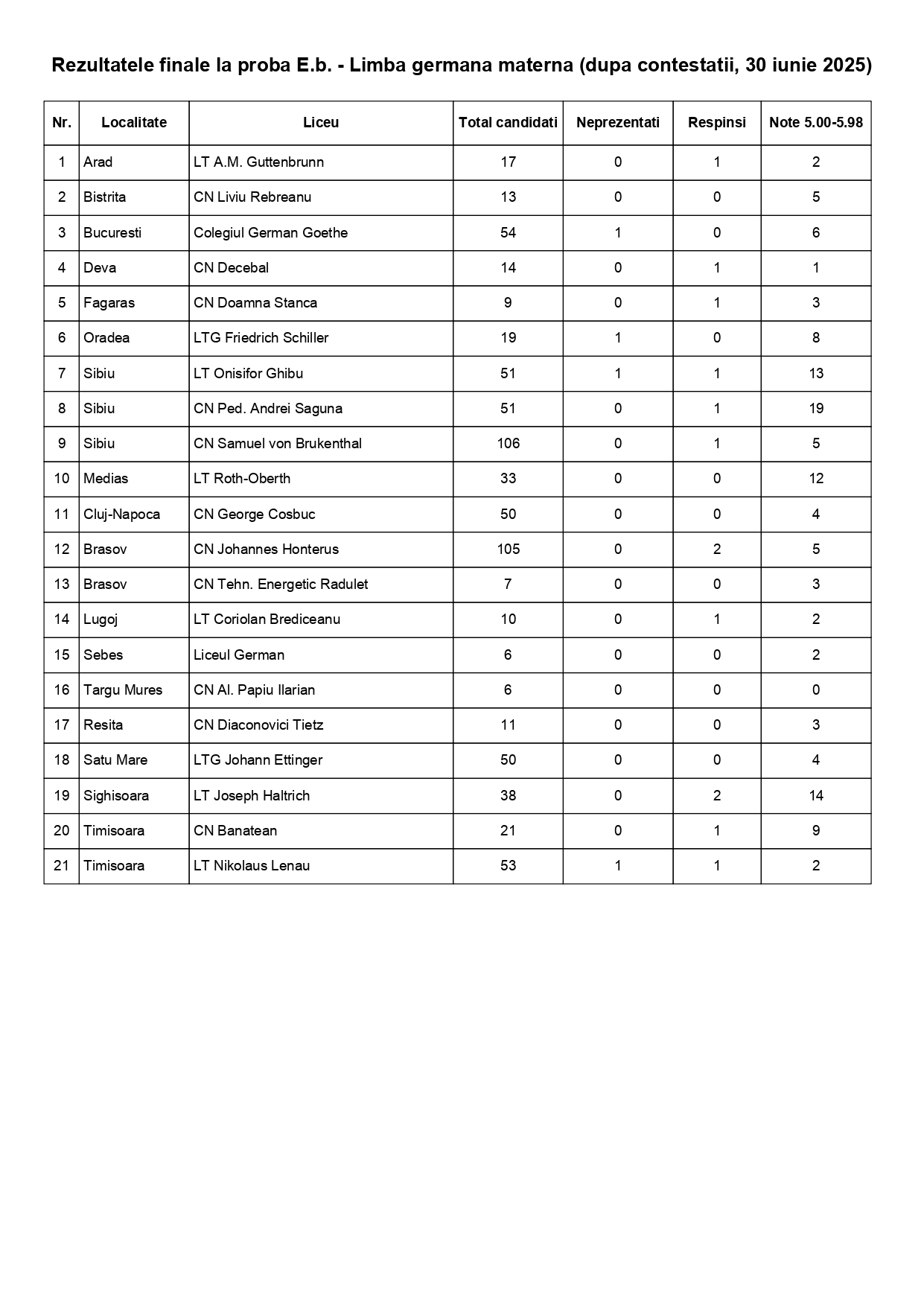 Promovarea Bacalaureatului presupune nota minimă 5 la fiecare probă scrisă și o medie generală de cel puțin 6.00. Proba E.b. contribuie la această medie – ceea ce înseamnă că un 5 la germană trebuie compensat cu note mai mari la celelalte discipline.