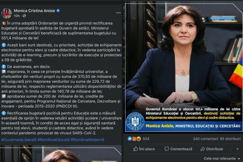 Monica Anisie scrie că „în urma adoptării Ordonanței de urgență privind rectificarea bugetară aprobată în ședința de Guvern de astăzi, Ministerul Educației și Cercetării beneficiază de suplimentarea bugetului cu 551,4 milioane de lei!”.