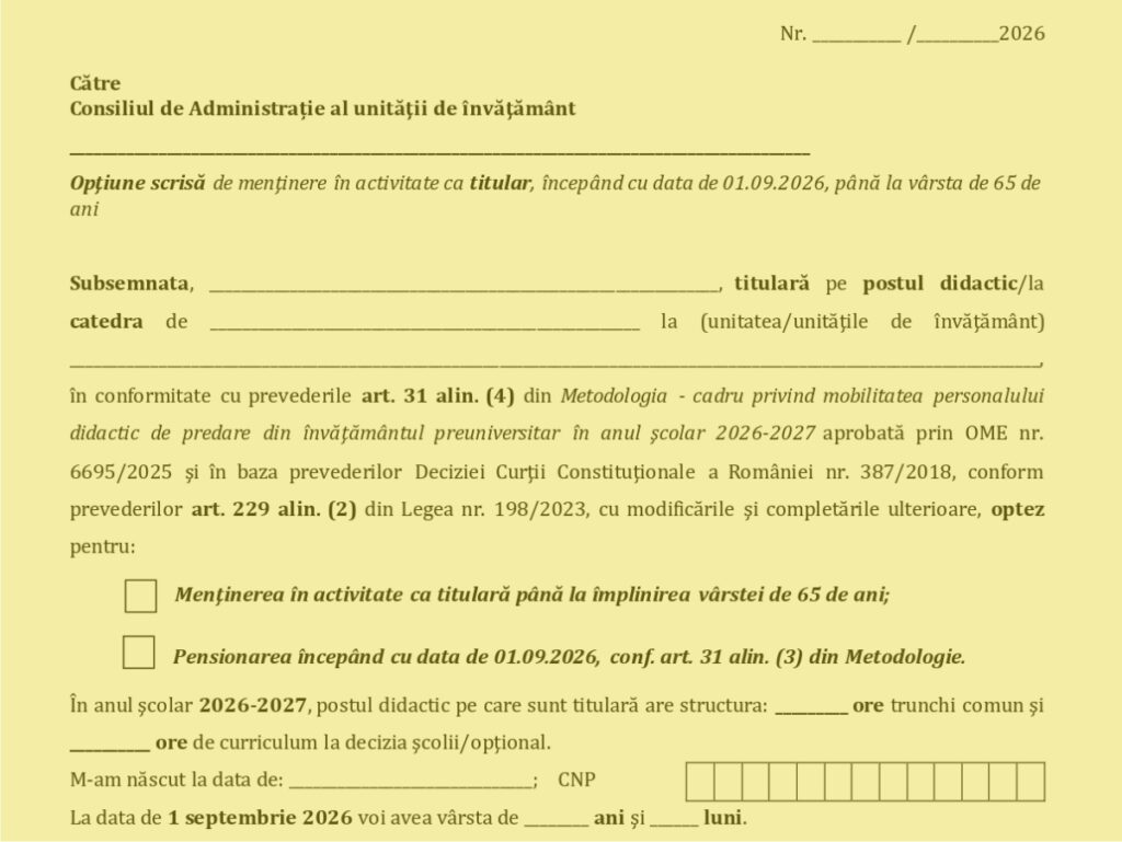 Inspectoratul Școlar Județean Maramureș a publicat un model de cerere pentru menţinerea în activitate ca titular, începând cu data de 01.09.2026, până la vârsta de 65 de ani. Edupedu.ro a scris că în perioada 12-23 ianuarie se întocmesc listele cu profesoarele care optează pentru menţinerea în activitate ca titular până la împlinirea vârstei de 65 de ani, potrivit metodologiei-cadru de mobilitate pentru anul școlar 2026-2027.