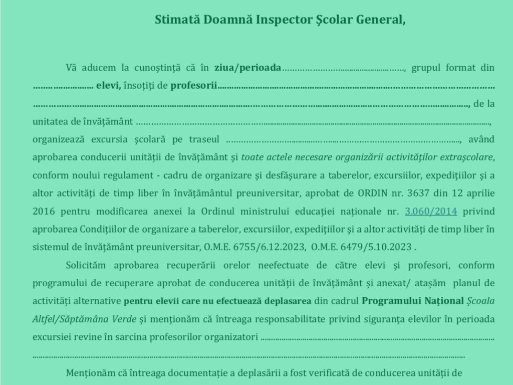 Referitor la documentul publicat de ISJ Iași, acesta trebuie completat de conducerea școlilor și depus pentru aprobare, în cazul în care se organizează excursii în anul școlar 2025-2026. Activitățile din „Școala altfel” și „Săptămâna verde” sunt reglementate prin Ordinul ministrului Educației nr. 3637/2016, O.M.E. 6755/2023 și O.M.E. 6479/5.10.2023
