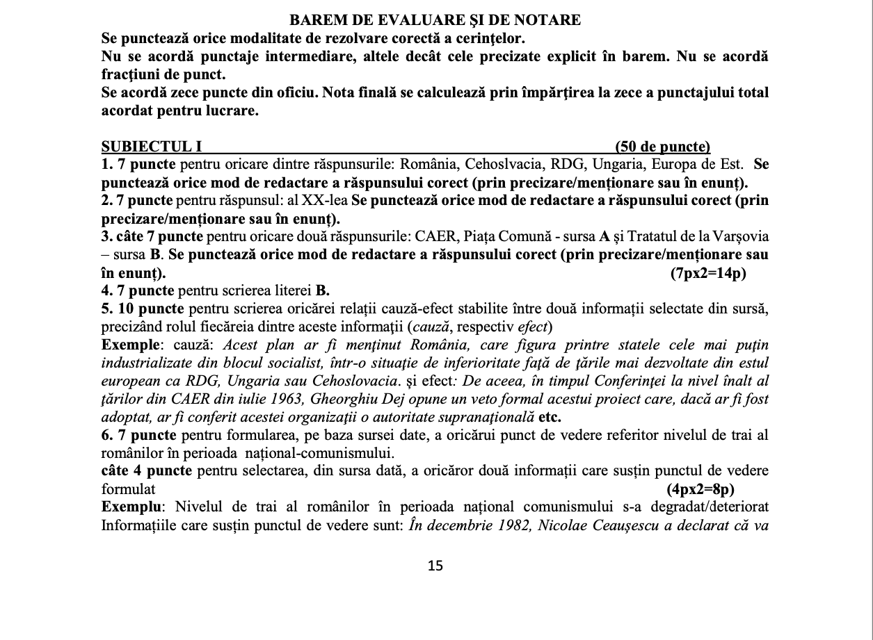 Barem model test inițial – Istorie clasa a XII-a: