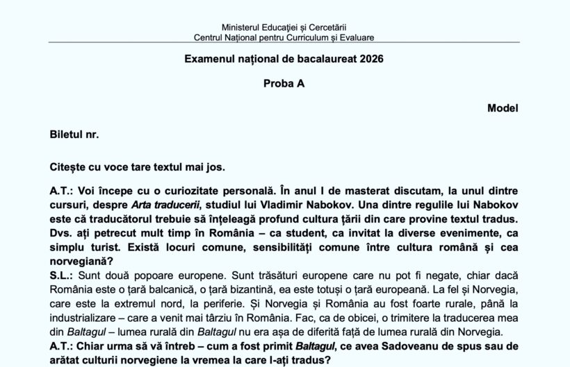 Model de subiect – competențe limba română Bacalaureat 2026