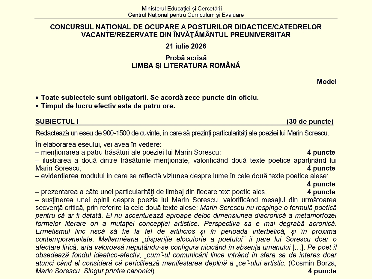 DOCUMENT DESCARCĂ SUBIECT Limba și literatura română Titularizare 2026 – model: