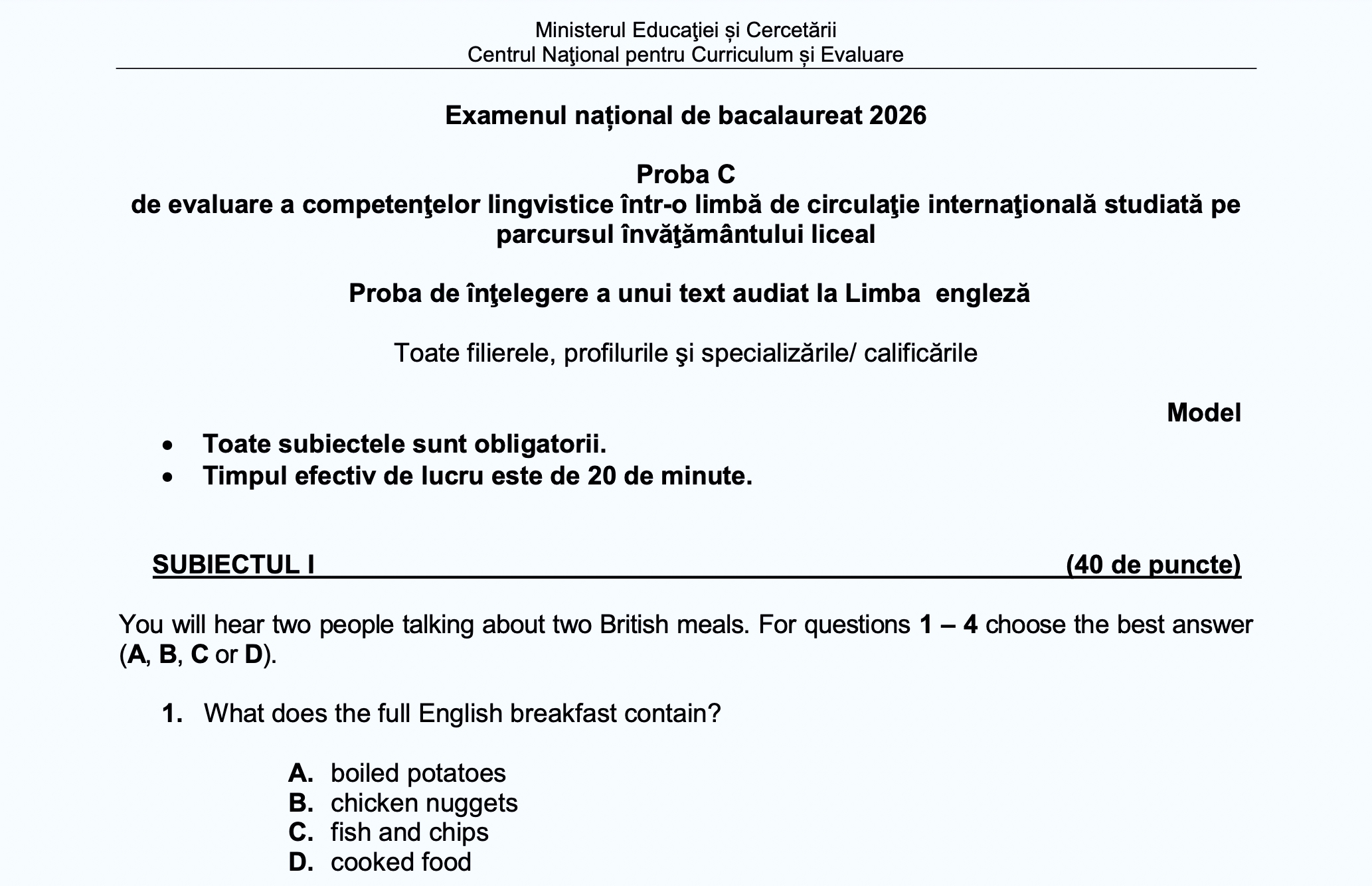 Model de subiect – competențe în limba engleză BAC 2026 AUDIO: