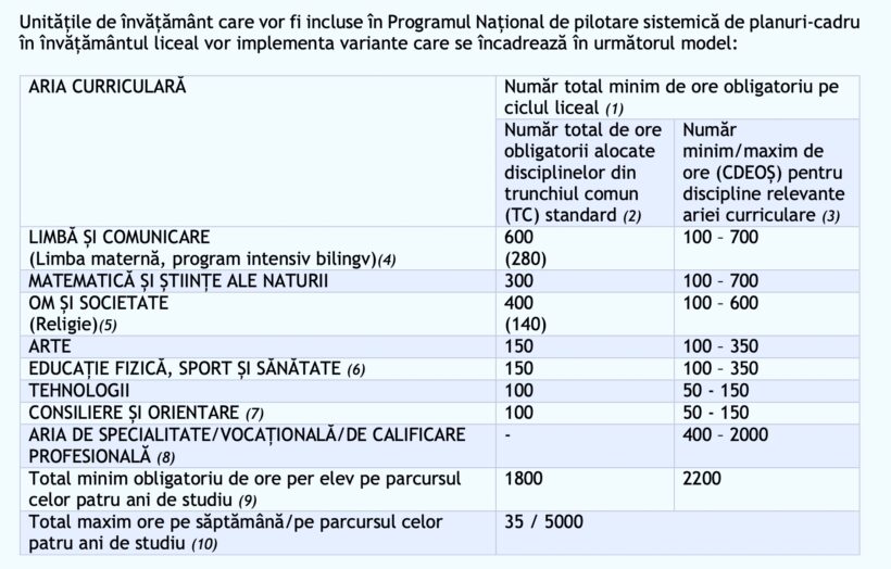 Modelul de plan cadru de liceu din Programul Național de pilotare din Anexa 1