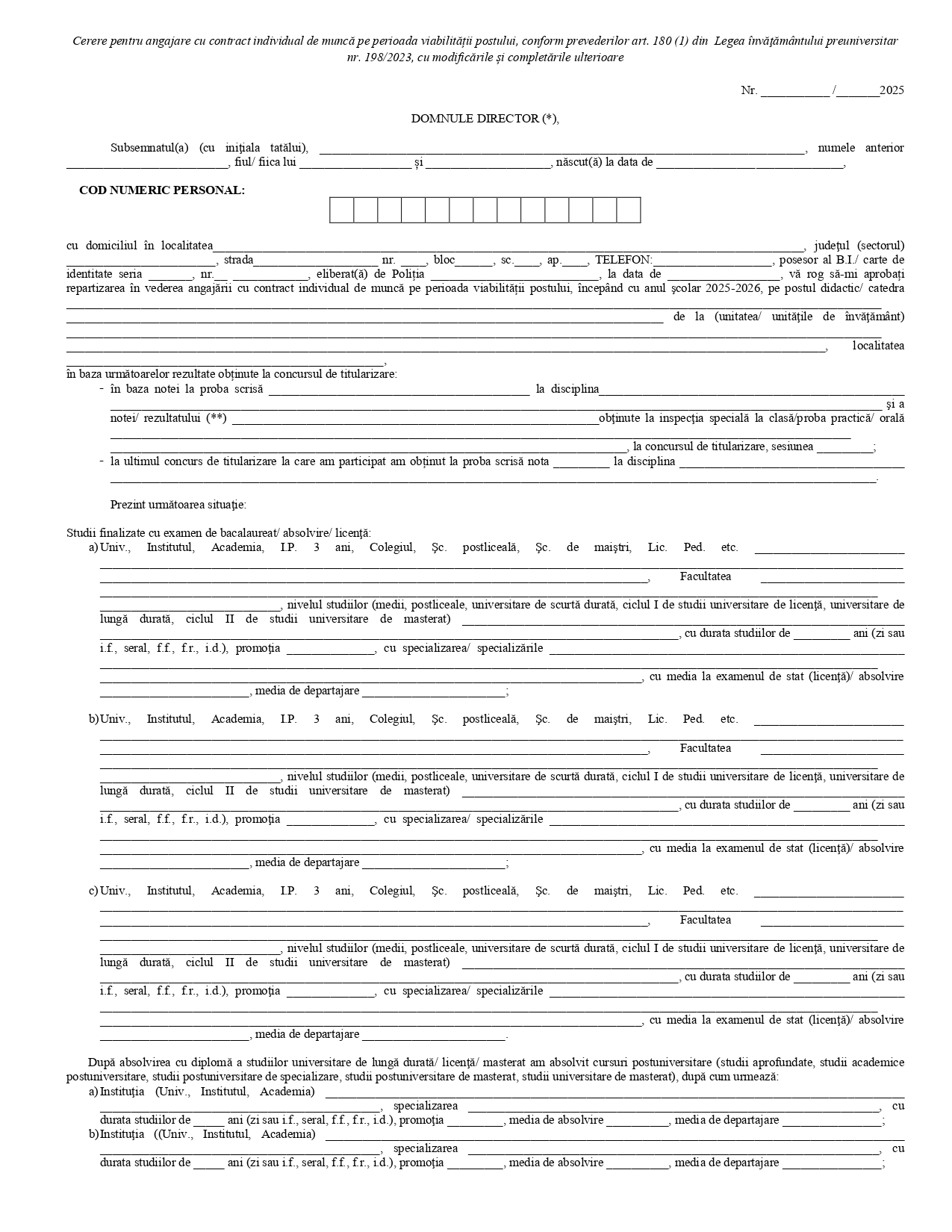 6) Modificarea duratei contractului individual de muncă din durată determinată de un an în contract individual de muncă pe durata de viabilitate a postului/catedrei: