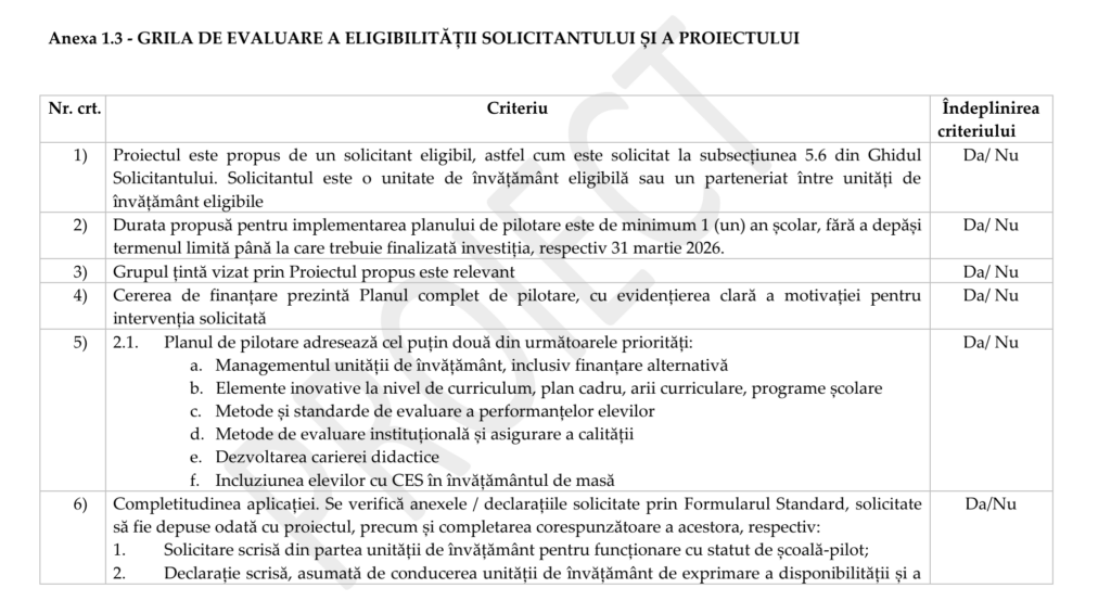 În cadrul apelului de proiecte pot aplica atât unitățile de învățământ care dețin deja statut de unitate-pilot, cât și cele care nu dețin acest statut.