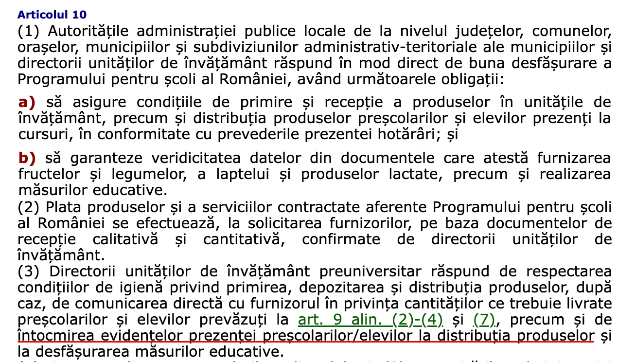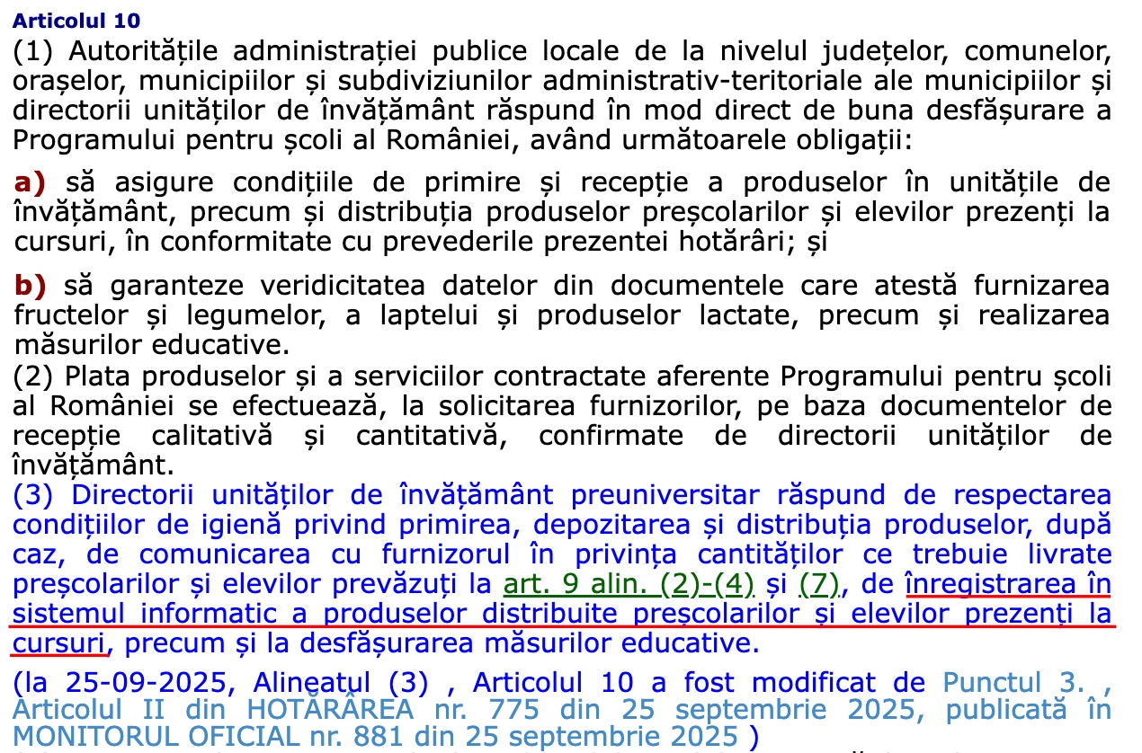 La articolul 10, alineatul (3) se modifică și va avea următorul cuprins: „(3) Directorii unităților de învățământ preuniversitar răspund de respectarea condițiilor de igienă privind primirea, depozitarea și distribuția produselor, după caz, de comunicarea cu furnizorul în privința cantităților ce trebuie livrate preșcolarilor și elevilor prevăzuți la art. 9 alin. (2)-(4) și (7), de înregistrarea în sistemul informatic a produselor distribuite preșcolarilor și elevilor prezenți la cursuri, precum și la desfășurarea măsurilor educative.”