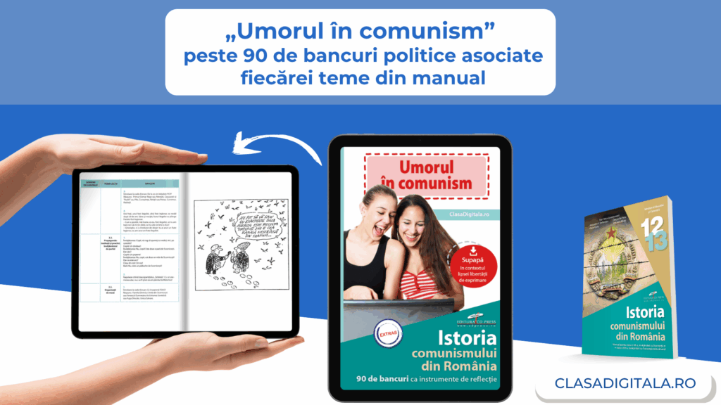 • Culegerea digitală „Umorul în comunism” – peste 90 de bancuri politice asociate fiecărei teme din manual, utilizabile la începutul lecției („La ce aspect credeți că se referă gluma?”) sau la final („Ce critică se ascunde în glumă?”). Extras: [Umorul în comunism – CLASA DIGITALĂ].