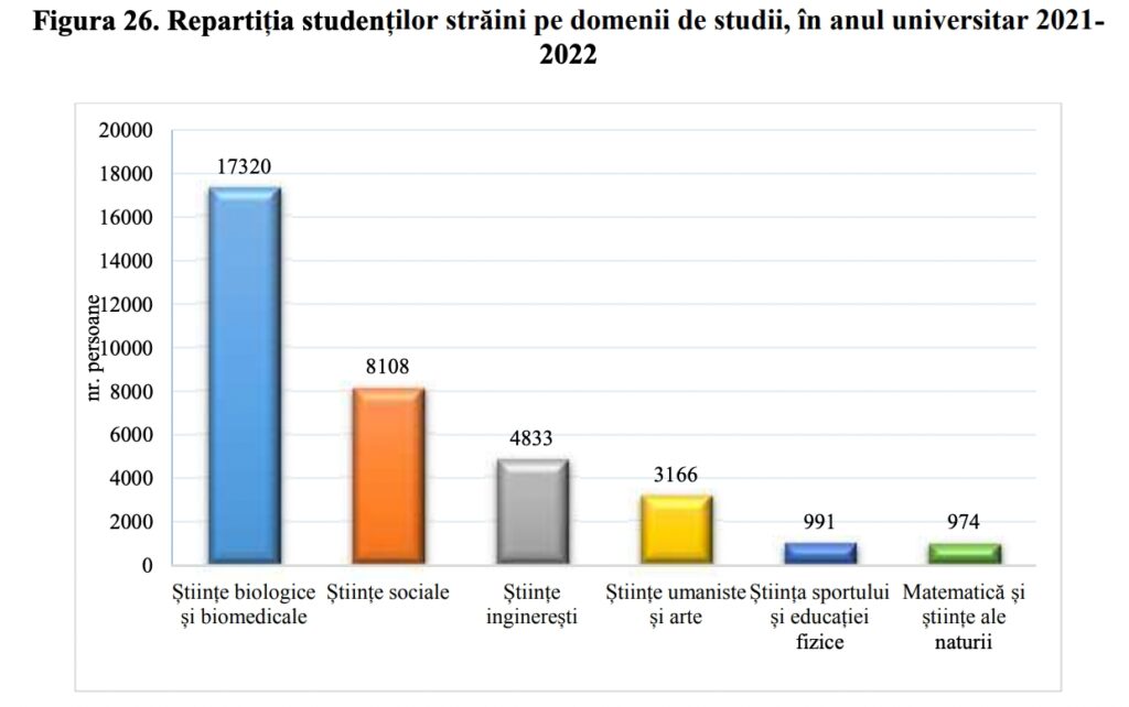 „Dintre cei 35.392 de studenți, din 149 de țări, care au studiat în România pe parcursul anului universitar 2021-2022, aproximativ 20.000 au ales programe de studii în limba română (57%)și peste 14.500 au urmat programe de studii în limbi străine ( 70% dintre aceștia au urmat cursuri în limba engleză, iar 30% în limba franceză)”, se arată în raportul menționat mai sus.