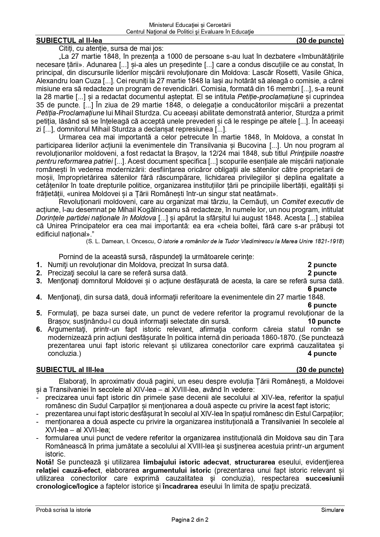 FOTO DOCUMENT Barem simulare BAC 2025 – Istorie: