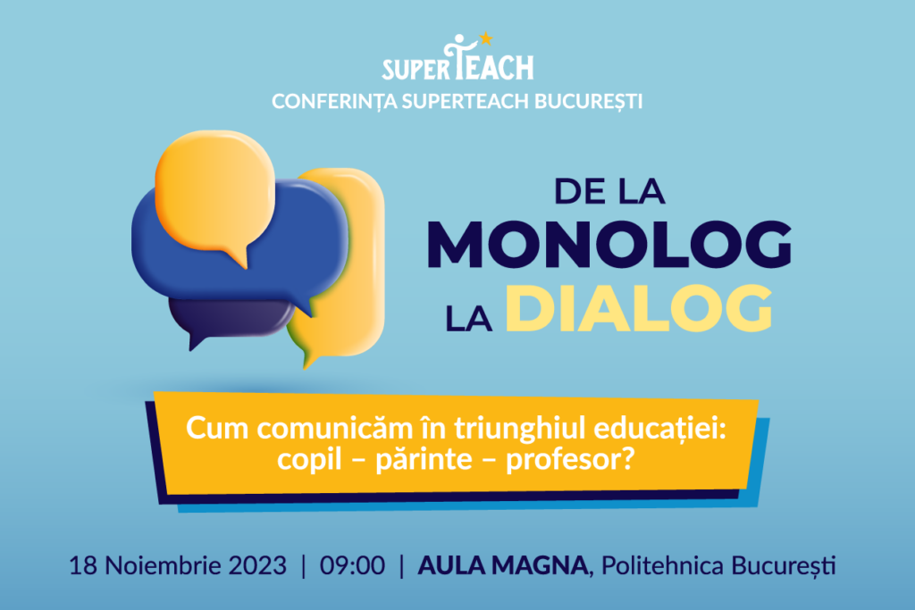 Prima Conferință SuperTeach dedicată atât profesorilor, cât și părinților va avea loc sâmbătă, 18 noiembrie, la Aula Magna a Universității Politehnica București, începând cu ora 9.30, și va fi dedicată colaborării și comunicării în triunghiul părinte-profesor-elev.
