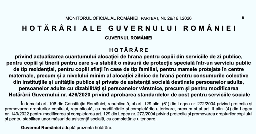 DOCUMENT Hotărâre de Guvern nr. 6, din 14 ianuarie 2026, privind actualizarea cuantumului alocației de hrană pentru copiii din serviciile de zi publice, pentru copiii și tinerii pentru care s-a stabilit o măsură de protecție specială într-un serviciu public de tip rezidențial, pentru copiii aflați în case de tip familial, pentru mamele protejate în centre maternale, precum și a nivelului minim al alocației zilnice de hrană pentru consumurile colective din instituțiile și unitățile publice și private de asistență socială destinate persoanelor adulte, persoanelor adulte cu dizabilități și persoanelor vârstnice, precum și pentru modificarea Hotărârii Guvernului nr. 426/2020 privind aprobarea standardelor de cost pentru serviciile sociale