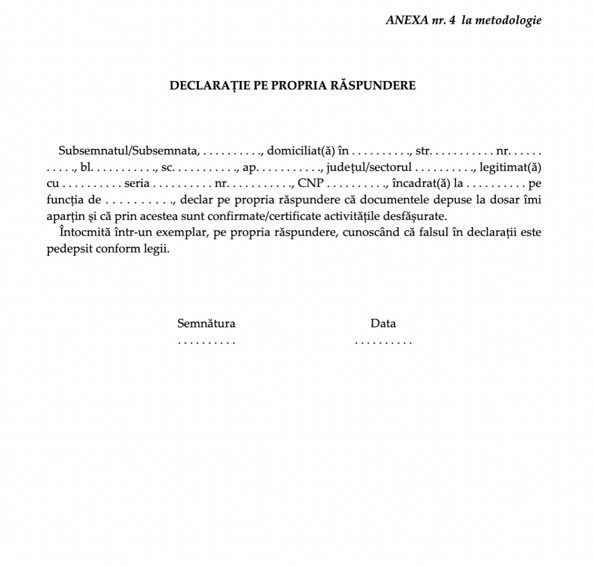 g) declaraţia pe propria răspundere prin care candidatul confirmă că documentele depuse la dosar îi aparţin şi că prin acestea sunt certificate activităţile desfăşurate, conform modelulului prevăzut în anexa nr. 4 la prezenta metodologie;