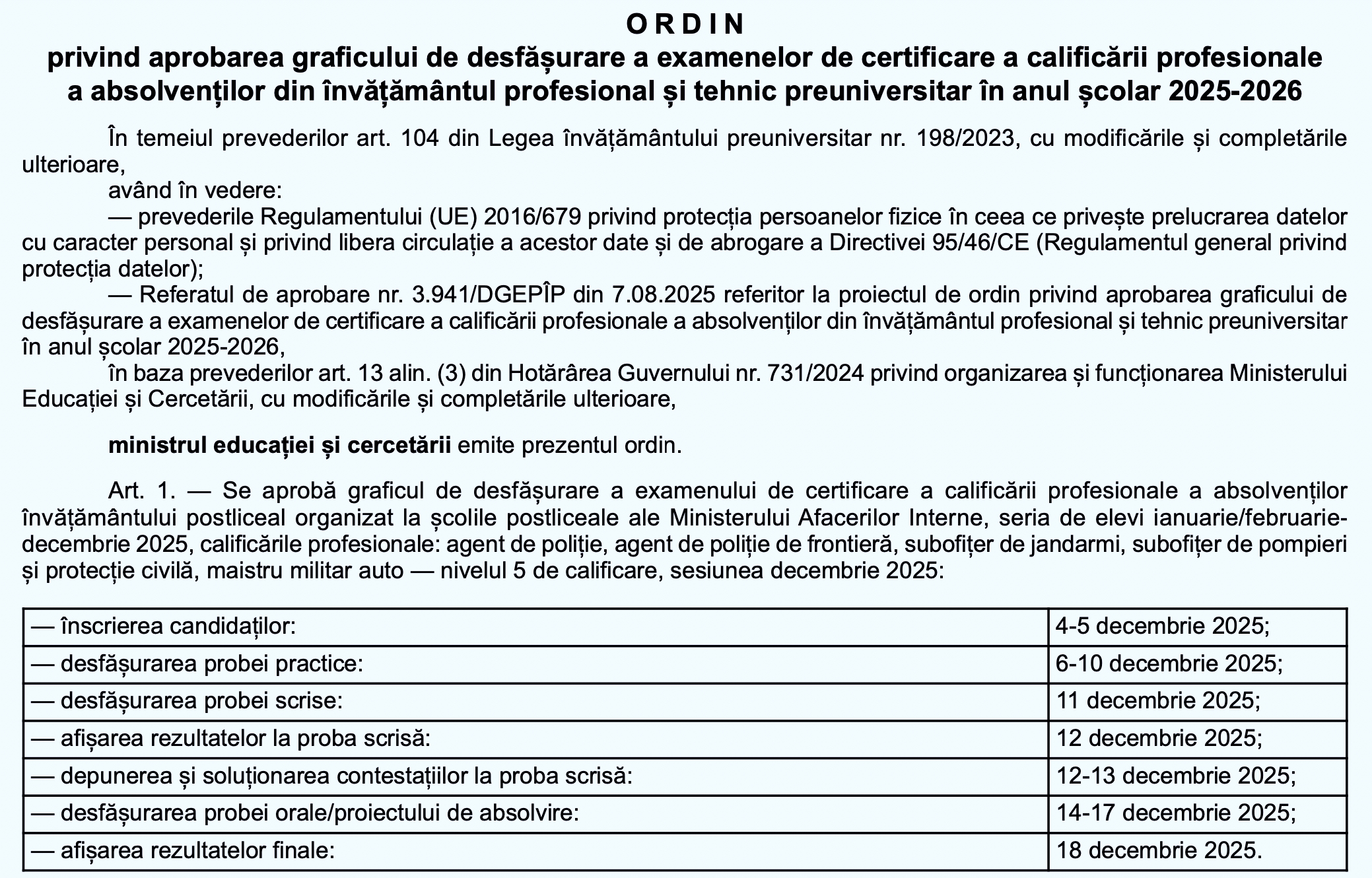 Calendarul examenelor de certificare a calificării profesionale a absolvenților din învățământul profesional și tehnic preuniversitar în anul școlar 2025-2026 a fost publicat în Monitorul Oficial. Este vorba despre ordinul ministrului Educației și Cercetării nr. 6.056 din 29 august 2025.