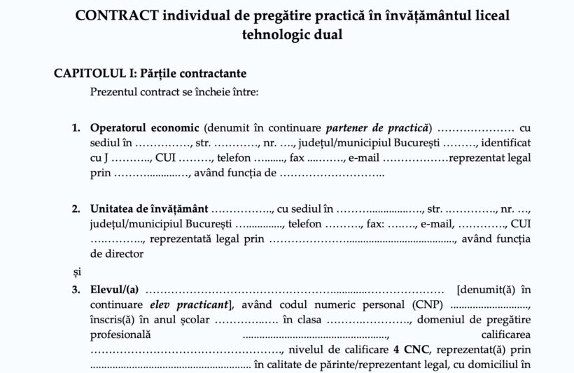 Modelul contractului individual de pregătire practică din învățământul liceal tehnologic dual