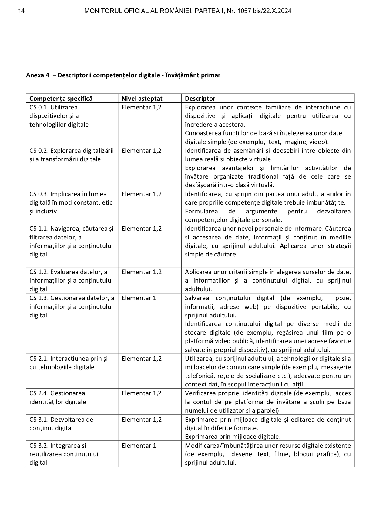 Din anul școlar 2024-2025, elevii de clasele primare ar trebui să identifice conținutul digital pe diverse medii de stocare digitale (de exemplu, regăsirea unui film pe o platformă video publică, identificarea unei adrese favorite salvate în propriul dispozitiv), cu sprijinul adultului, potrivit unui ordin publicat în Monitorul Oficial. Este vorba despre ordinul ministrului educației nr. 6.466 din 30 august 2024 privind aprobarea Cadrului de competențe digitale pentru elevi. Vezi mai jos, în articol, care sunt competențele pentru elevii de gimnaziu și pentru cei de liceu.