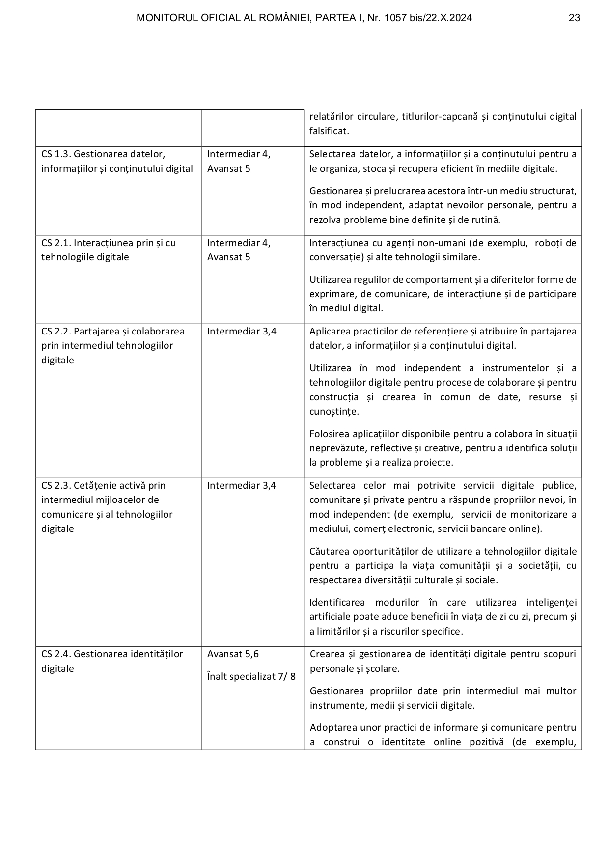 (4) Alte arii de competență vizează alfabetizarea informațională și a datelor, comunicarea și colaborarea digitală, crearea de conținut digital, siguranța cibernetică și utilizarea responsabilă a tehnologiei. Aceste arii acoperă o gamă largă de abilități, de la căutarea și evaluarea informației până la crearea de conținut digital și aplicarea tehnologiei în diverse domenii (de exemplu, antreprenoriat, științe, arte etc.).