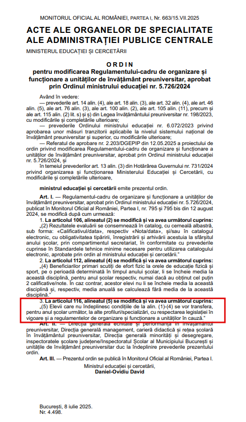„Elevii care nu îndeplinesc condițiile de la alin. (1)-(4) se vor transfera, pentru anul școlar următor, la alte profiluri/specializări, cu respectarea legislației în vigoare și a regulamentelor de organizare și funcționare a unităților în cauză”, se arată la articolul I, punctul 3 al ordinului.