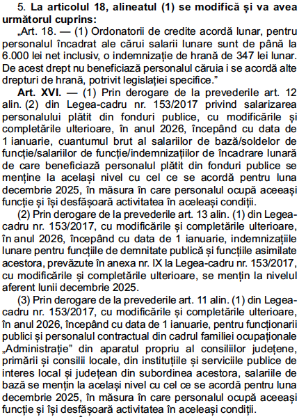 Art. 18. — (1) Ordonatorii de credite acordă lunar, pentru personalul încadrat ale cărui salarii lunare sunt de până la 6.000 lei net inclusiv, o indemnizație de hrană de 347 lei lunar. De acest drept nu beneficiază personalul căruia i se acordă alte drepturi de hrană, potrivit legislației specifice.”