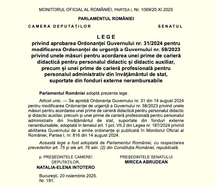 Legea care modifică ordonanța de urgență pentru acordarea unei prime de carieră didactică pentru personalul didactic și didactic auxiliar, precum și unei prime de carieră profesională pentru personalul administrativ din învățământul de stat suportate din fonduri externe nerambursabile, a fost publicată în Monitorul Oficial, pe 20 noiembrie. Amintim, acordarea primelor a fost blocată anul acesta prin ordonanța trenuleț, dată de Guvernul Ciolacu.