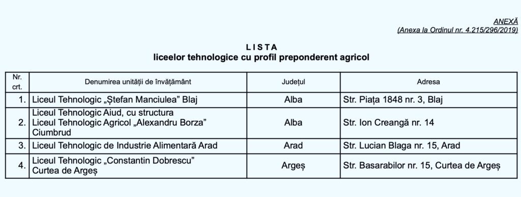 Noua listă a liceelor tehnologice cu profil preponderent agricol a fost publicată în Monitorul Oficial, pe 26 noiembrie. Deși numărul total de licee rămâne 59, trei licee dispar ca unități independente și devin structuri ale altor licee, în urma comasărilor, un liceu este eliminat, iar altele apar pentru prima dată în listă.