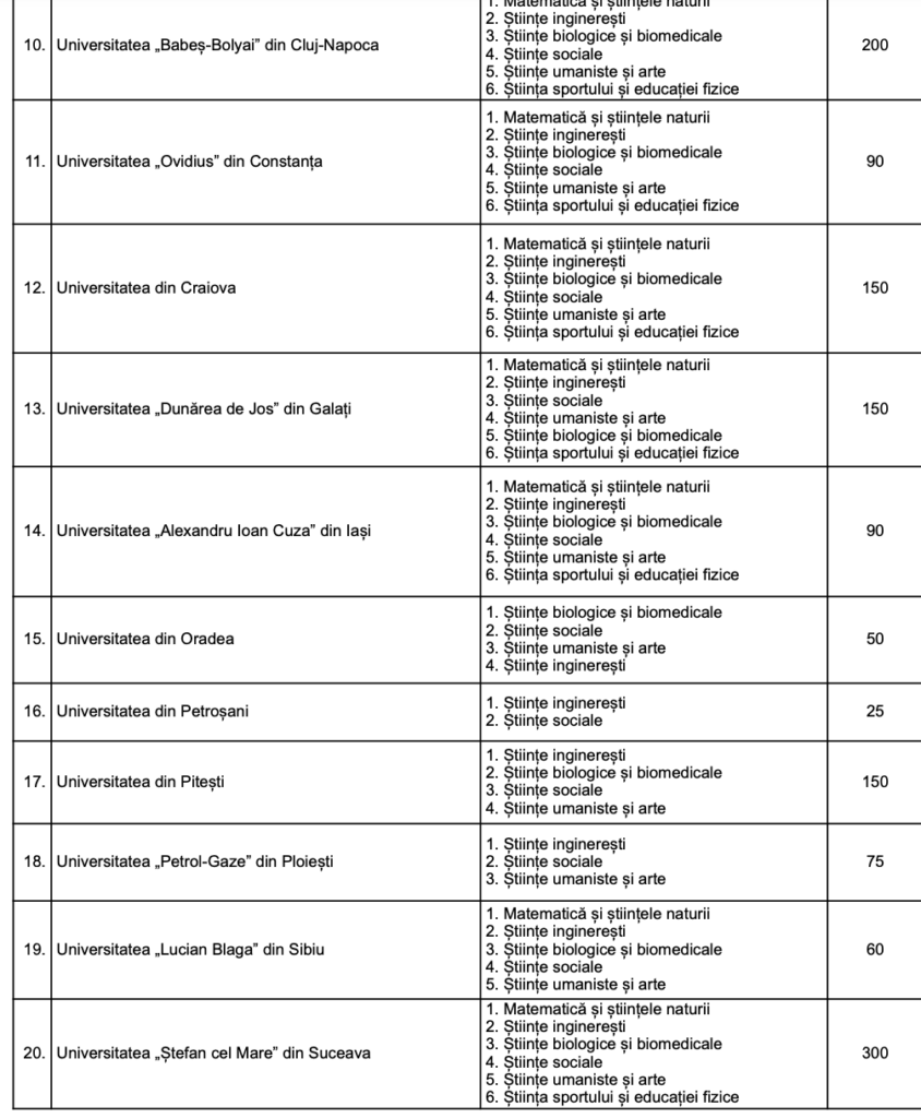 Universitatea București și Universitatea Ștefan cel Mare din Suceava oferă cele mai multe locuri, câte 300, pentru cele mai multe domenii: Matematică și științele naturii, științe inginerești, științe biologice și biomedicale, științe sociale, științe umaniste și arte, știința sportului și educației fizice.