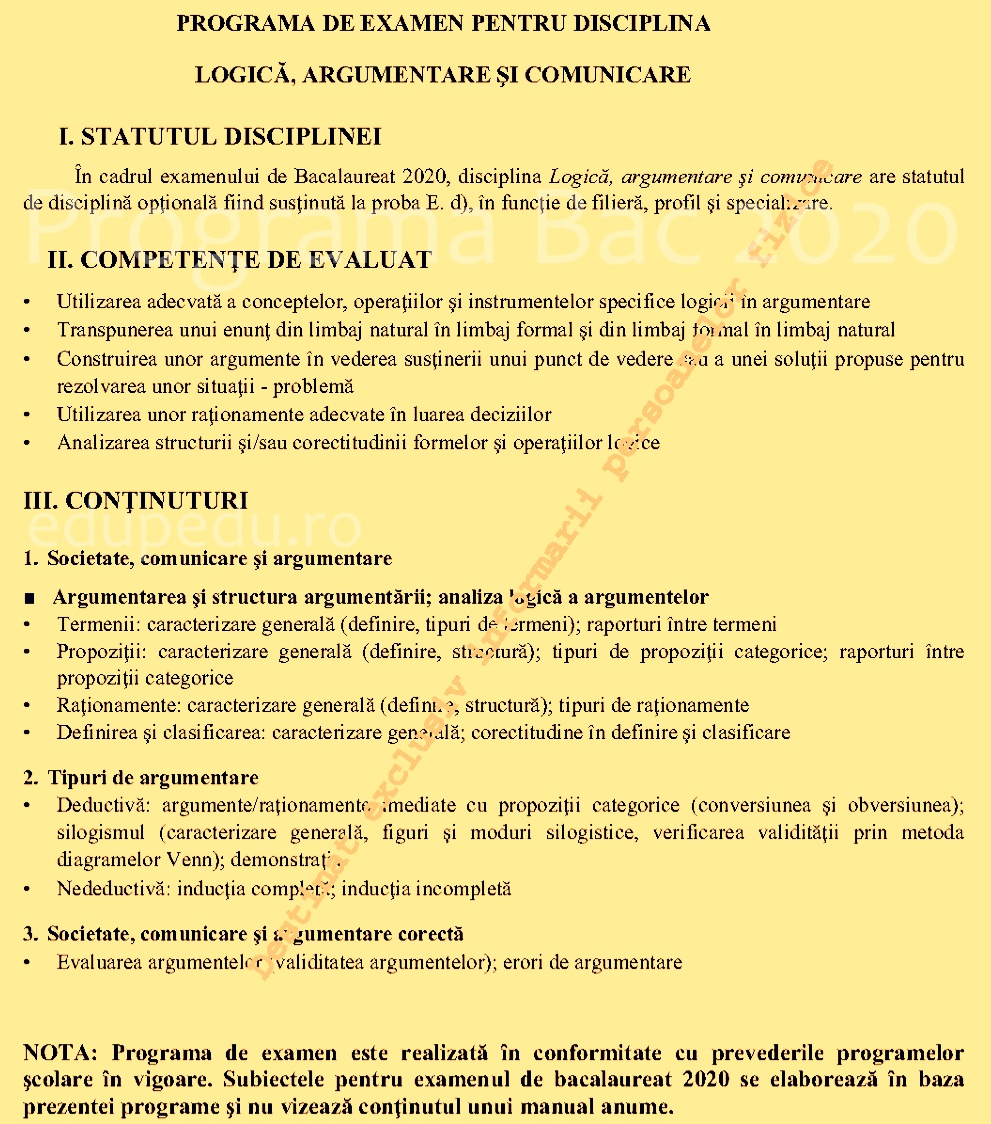 Programa pentru Bacalaureat 2020 la Logică, Argumentare, Comunicare