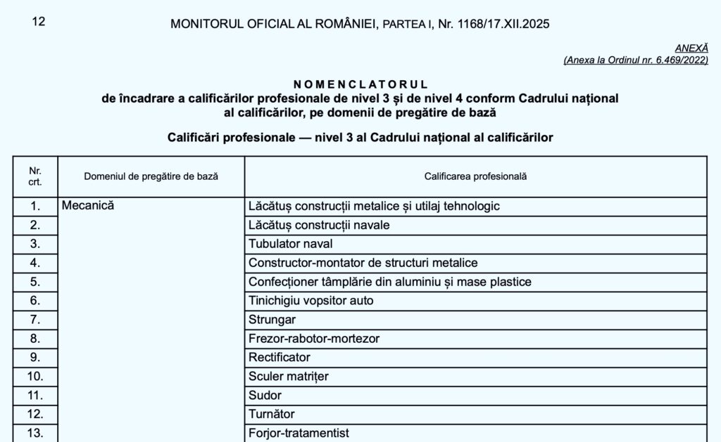 Ministerul Educației și Cercetării a actualizat Nomenclatorul de încadrare a calificărilor profesionale de nivel 3 și de nivel 4, conform Cadrului național al calificărilor, pentru învățământul liceal tehnologic, prin Ordinul ministrului educației nr. 6.884/2025, publicat în Monitorul Oficial pe 17 decembrie 2025.