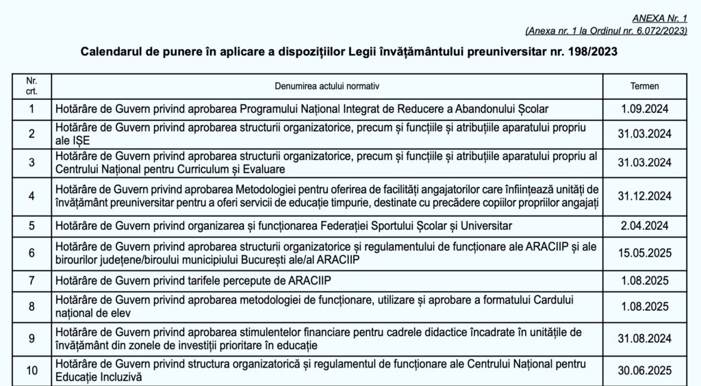 Calendarul de punere în aplicare a dispozițiilor Legii învățământului preuniversitar nr. 198/2023 cuprinde 204 de hotărâri de guvern și ordine de ministru și ultimul termen este 1 august 2027.