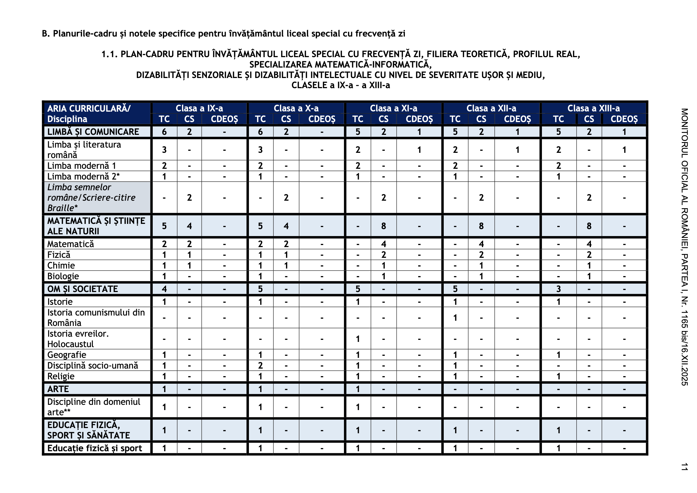1.1. Planul-cadru pentru învățământul liceal special cu frecvență zi, filiera teoretică, profil real, specializarea matematică-informatică, dizabilități senzoriale și dizabilități intelectuale cu nivel de severitate ușor și mediu, clasele a IX-a – a XIII-a;