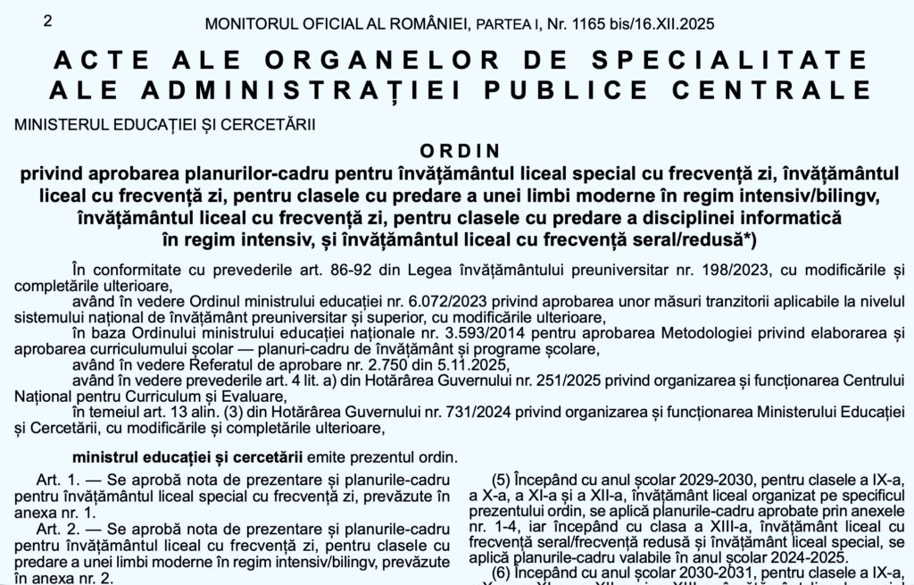 Planurile-cadru de liceu pentru clasele cu predare a unei limbi moderne în regim intensiv sau bilingv, clase cu predarea disciplinei Informatică în regim intensiv și pentru învățământul liceal cu frecvență seral/redusă, aplicabile începând cu generația de elevi care intră în clasa a IX-a în anul școlar 2026-2027, au fost publicate în Monitorul Oficial pe 17 decembrie.