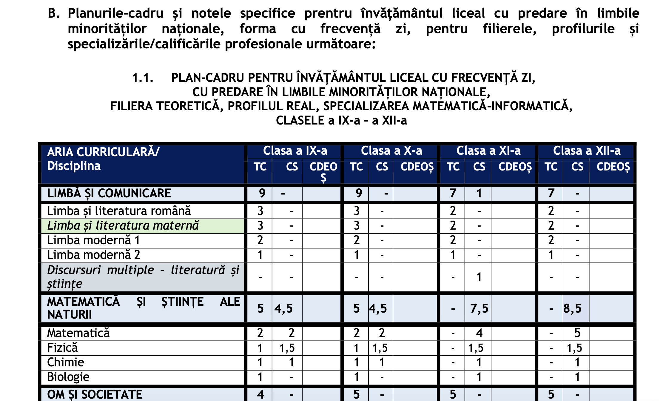 1.1. Plan-cadru pentru învățământul liceal cu frecvență zi, cu predare în limbile minorităților naționale filiera teoretică, profilul real, specializarea matematică-informatică, clasele a IX-a – a XII-a