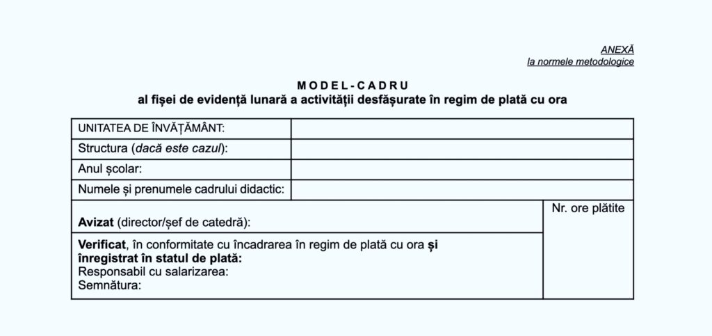 Art. 6. (4) Plata activității de predare-învățare-evaluare în regim de plată cu ora se efectuează numai în baza completării și după semnarea condicii de prezență la unitatea de învățământ și cu întocmirea și depunerea Fișei de evidență lunară a activității desfășurate în regim de plată cu ora, conform modelului-cadru prevăzut în anexa care face parte integrantă din prezentele norme metodologice, semnată de cadrul didactic.