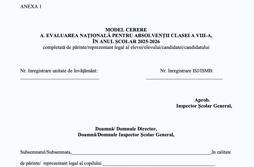 Ministerul Educației și Cercetării a publicat procedura pentru adaptarea condițiilor de examen la Evaluarea Națională 2026 pentru elevii cu deficiențe de vedere, deficiențe de auz și tulburări de neurodezvoltare (TSA, TSI, ADHD, tulburare de dezvoltare intelectuală). Părinții depun cererea la conducerea școlii în care elevul este înscris, de regulă, înainte de desfășurarea simulării evaluării naționale, dar nu mai târziu de 12 iunie 2026, potrivit documentului.