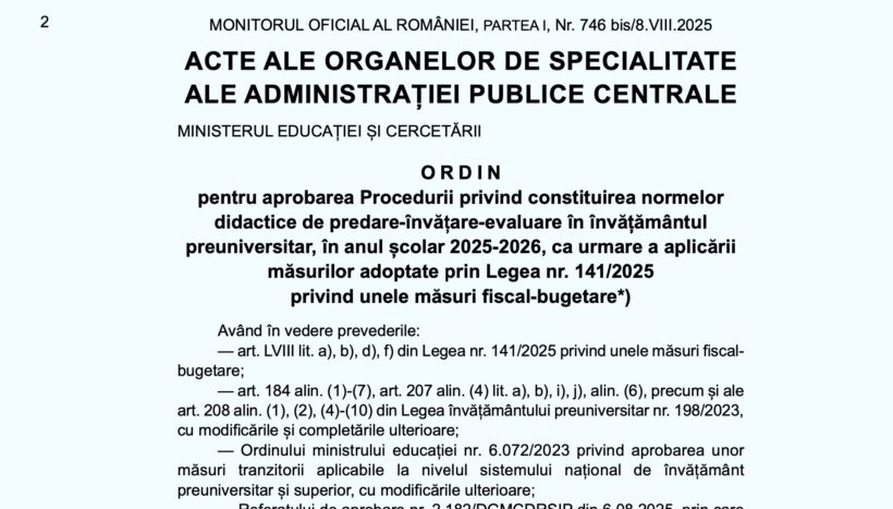 Ordinul ministrului educației nr. 5.198/2025 pentru aprobarea Procedurii privind constituirea normelor didactice de predare-învățare-evaluare în învățământul preuniversitar, în anul școlar 2025-2026, ca urmare a aplicării măsurilor adoptate prin Legea nr. 141/2025 a fost publicat în Monitorul Oficial vineri, 8 august, cu o lună înaintea începerii cursurilor din anul școlar 2025-2026.