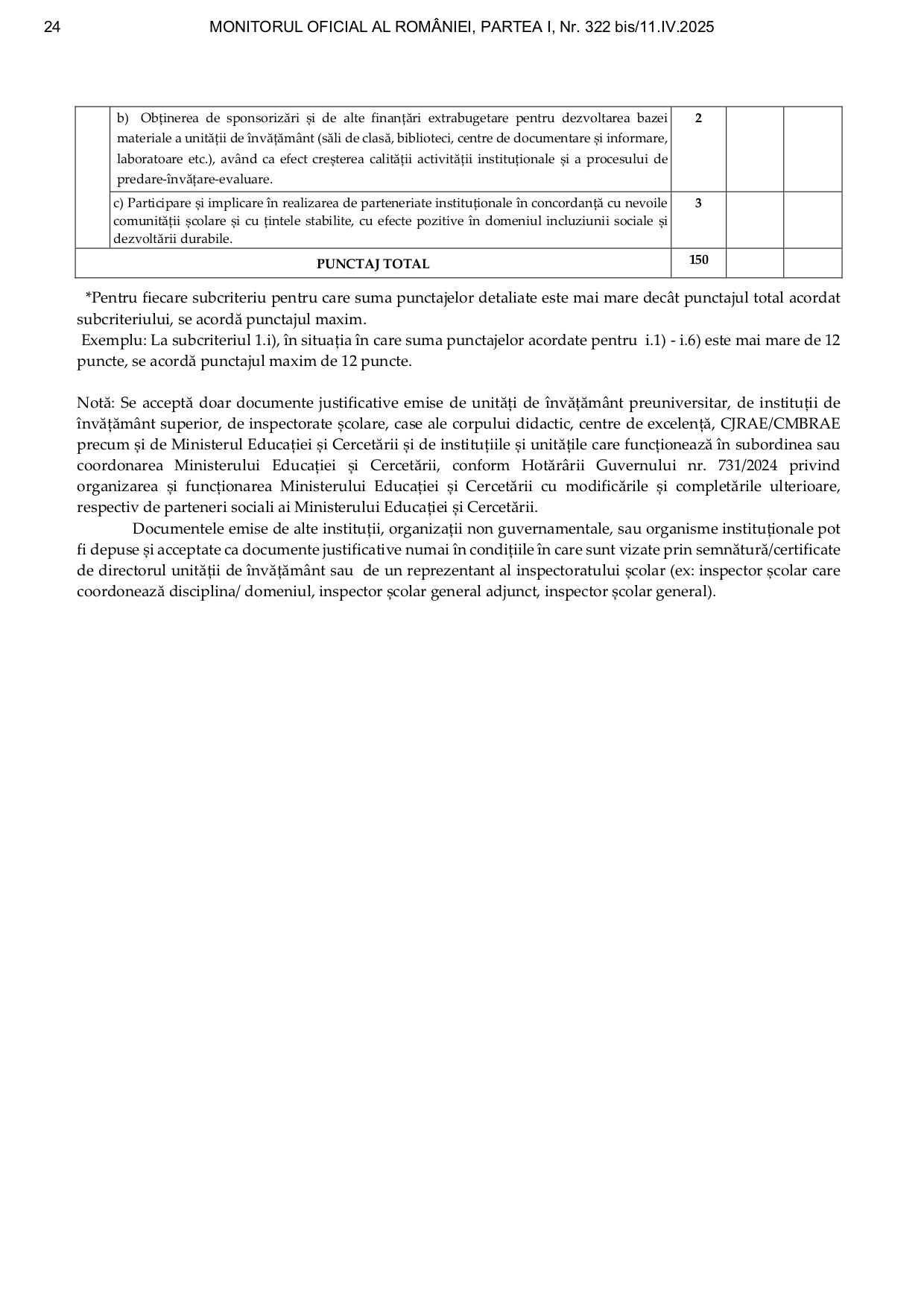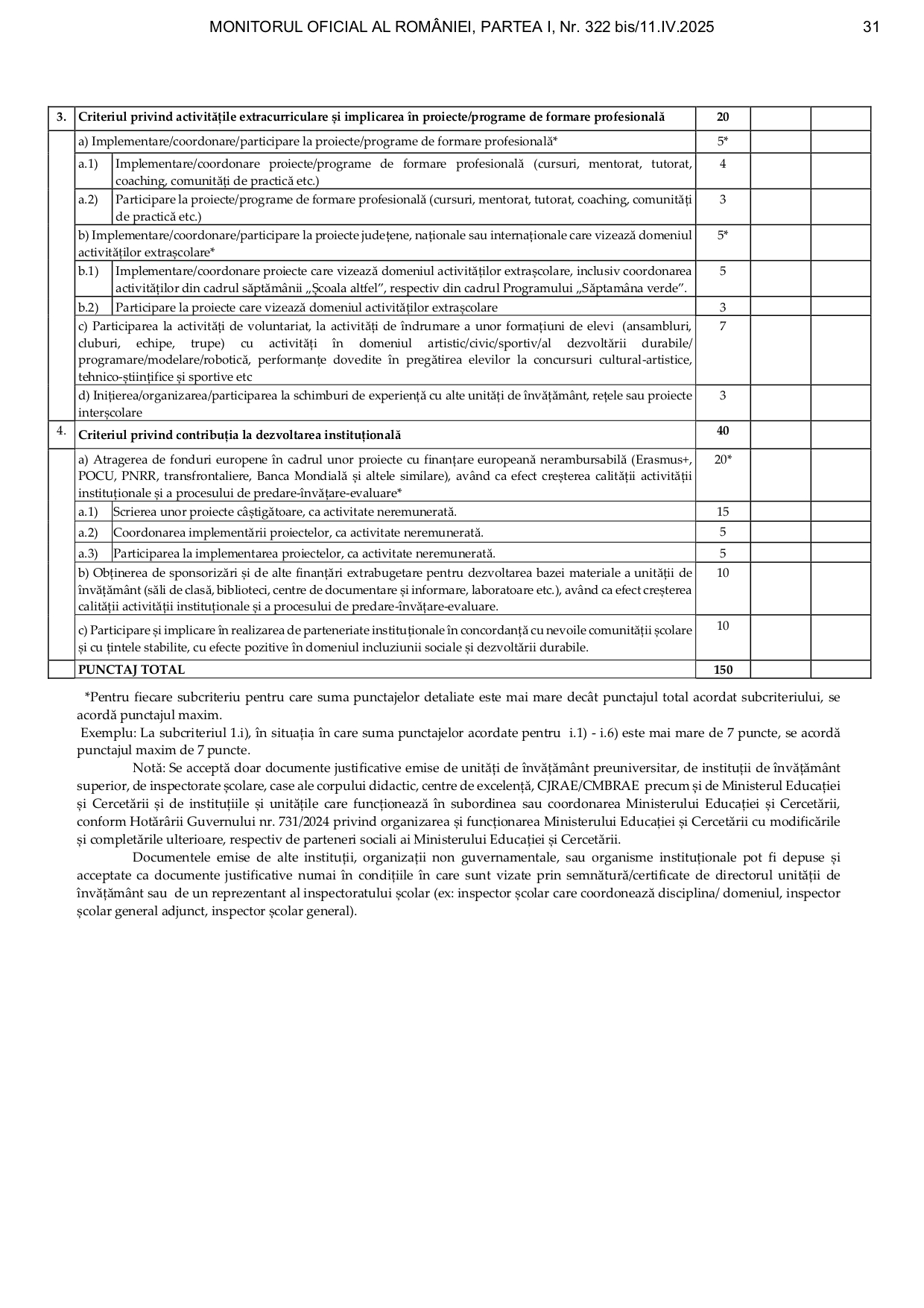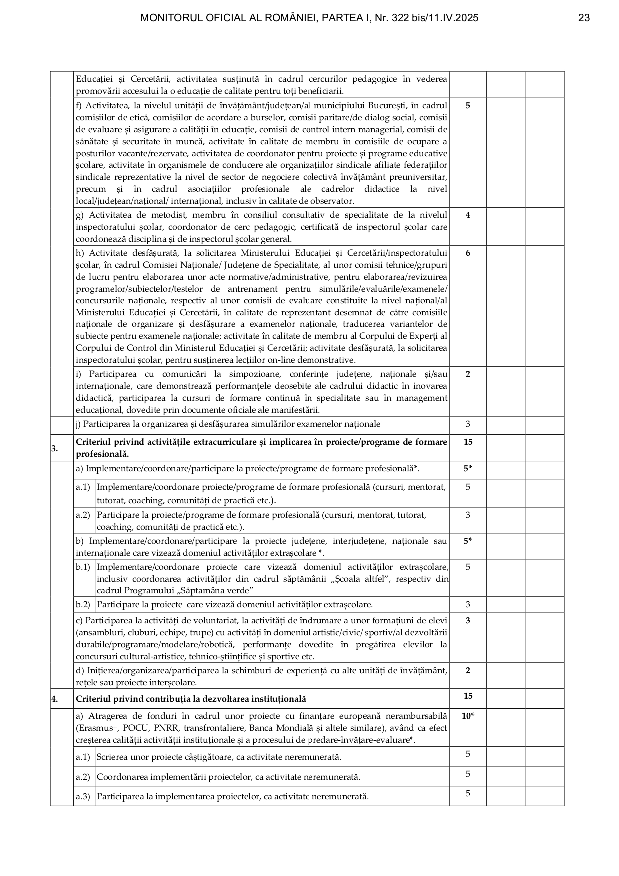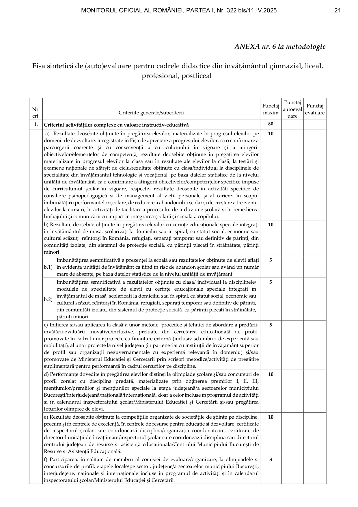 Punctajul pentru fiecare criteriu se găsește în fişa sintetică de (auto)evaluare pentru cadrele didactice din învăţământul gimnazial, liceal, profesional, postliceal.