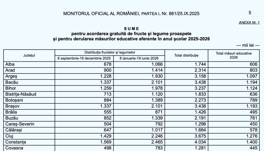Hotărârea privind Programul pentru școli al României pentru anul 2025-2026, care reglementează distribuirea de fructe, legume, lapte și produse de panificație în școli și grădinițe a fost publicată în Monitorul Oficial. Valoarea totală a alocării este de 798,1 milioane lei. Guvernul a aprobat modificările Programului lapte și fructe în școli pentru anul școlar 2025-2026 cu o întârziere de peste două luni față de momentul în care proiectul de act normativ a fost pus în dezbatere publică, pe 10 iulie, și după ce Edupedu.ro a semnalat blocajul săptămâna trecută.