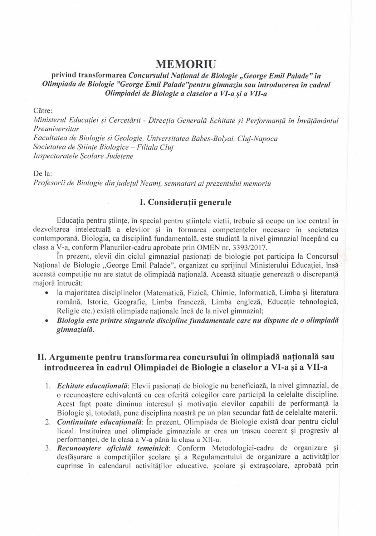 Semnatarii memoriului cer să fie transformat Concursului Național de Biologie „George Emil Palade” în Olimpiada de Biologie „George Emil Palade” pentru gimnaziu, din anul școlar 2025-2026. Sau să fie introdusă Olimpiada de Biologie la clasele a VI-a și a VII-a: