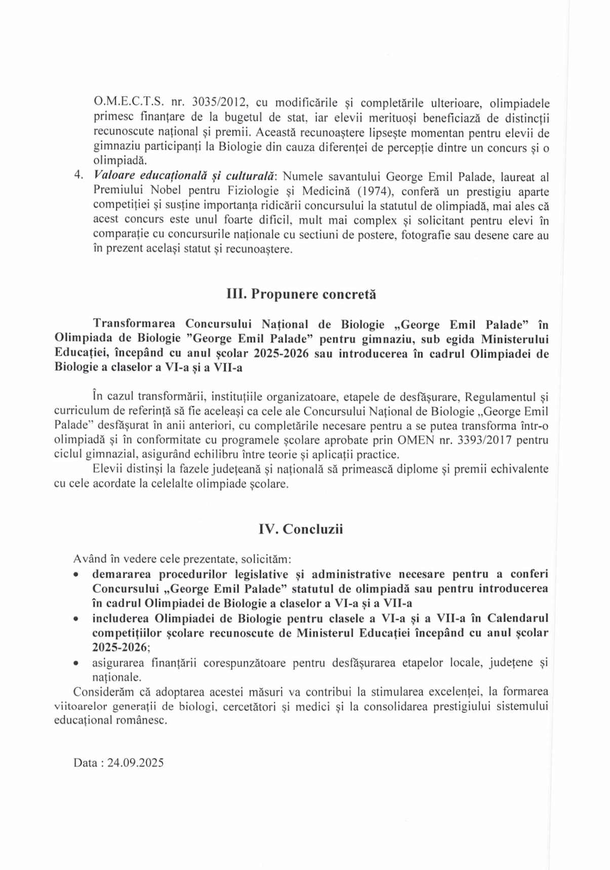 Transformarea Concursului Național de Biologie„George Emil Palade” în Olimpiada de Biologie „George Emil Palade” pentru gimnaziu, sub egida Ministerului Educației, începând cu anul școlar 2025-2026, sau introducerea în cadrul Olimpiadei de Biologie a claselor a VI-a și a VII-a.
