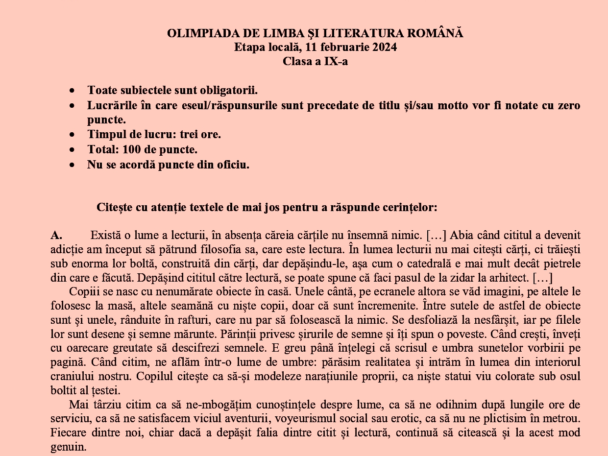 Redăm mai jos subiectele de la etapa locală din județul Neamț pentru OLLR 2024 – liceu: