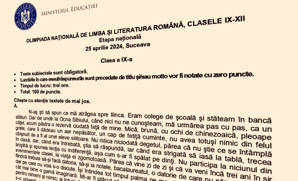 Elevii participanți la etapa națională a OLLR 2024 – Olimpiada de Limba și literatura română au susținut joi, 25 aprilie, proba scrisă a concursului. Subiectele și baremele, pentru elevii de liceu aflați la Suceava, au fost publicate de organizatori pe site-ul concursului.