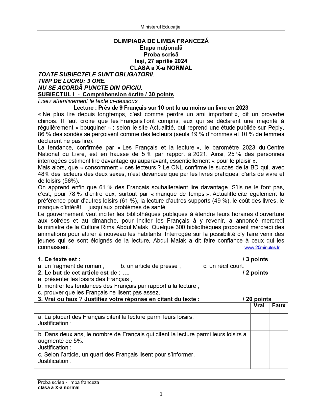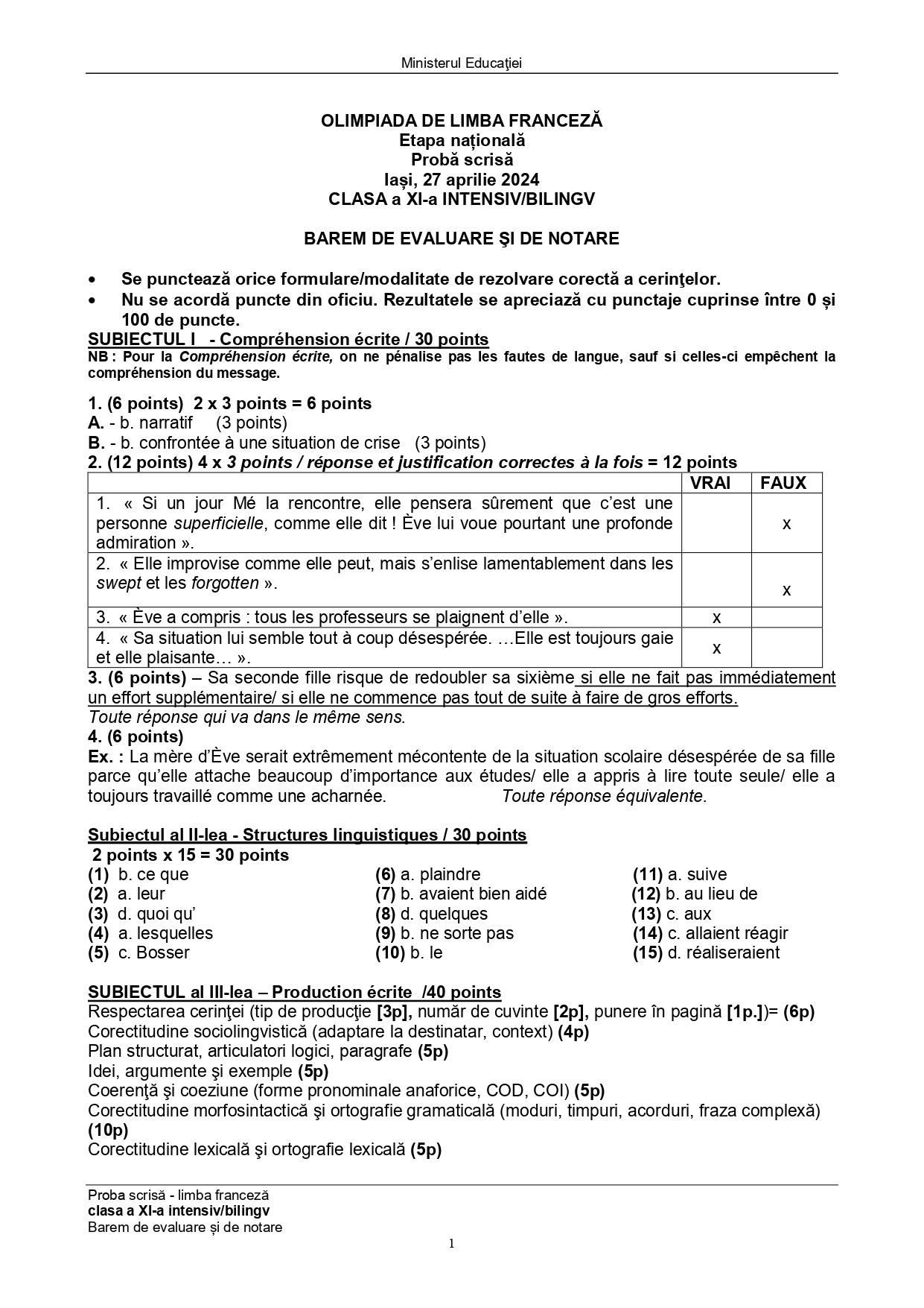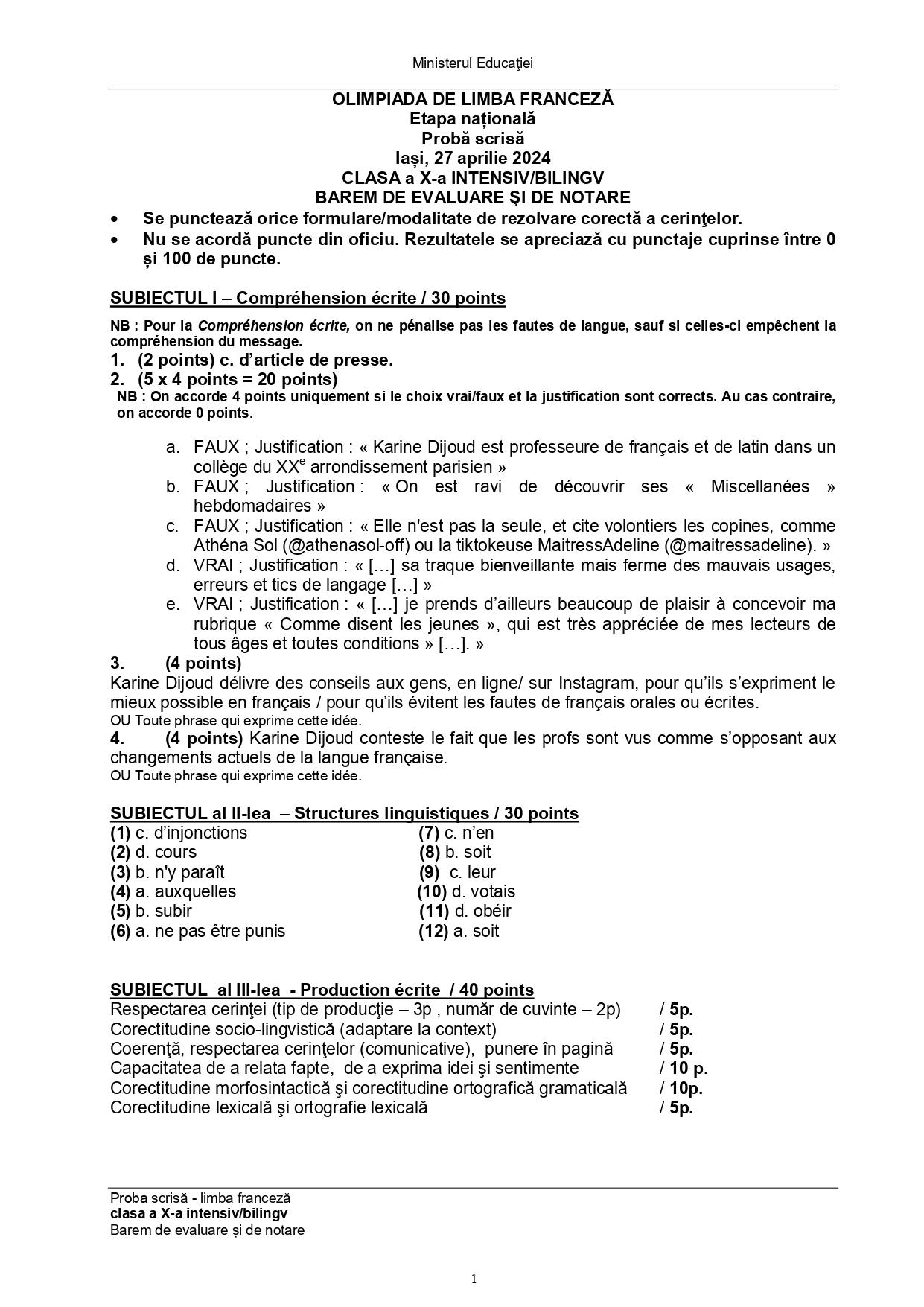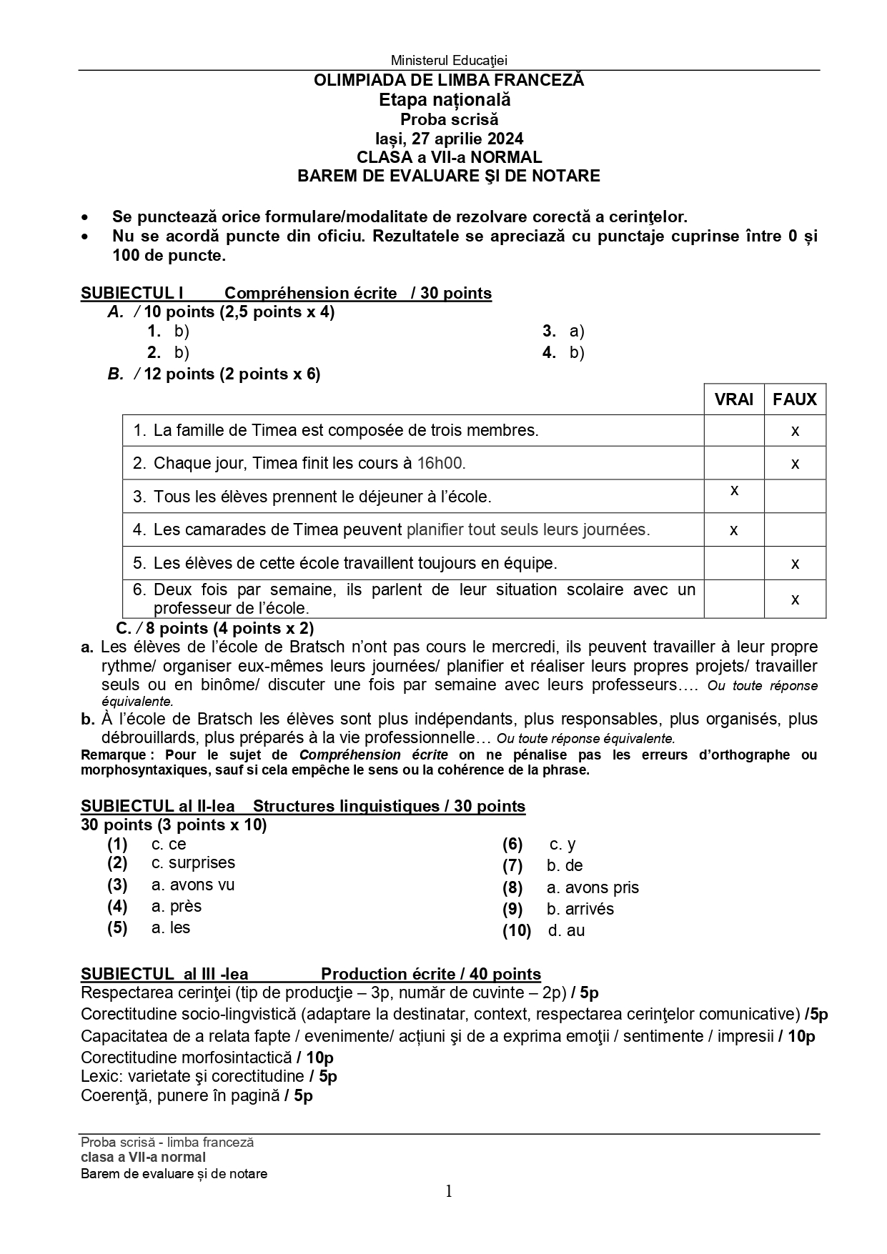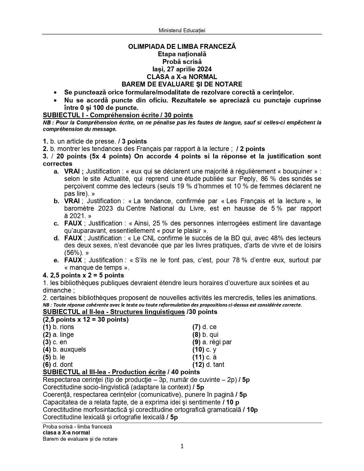 Subiectele și baremele de la Olimpiada Națională de Limba franceză (ONLF) 2024 de la Iași au fost publicate de organizatori sâmbătă seară, 27 aprilie, după probe. Documentele, pentru fiecare din cele două regimuri de studiu ale limbii – normal (N) sau intensiv/bilingv (B) pot fi descărcate mai jos din articol.