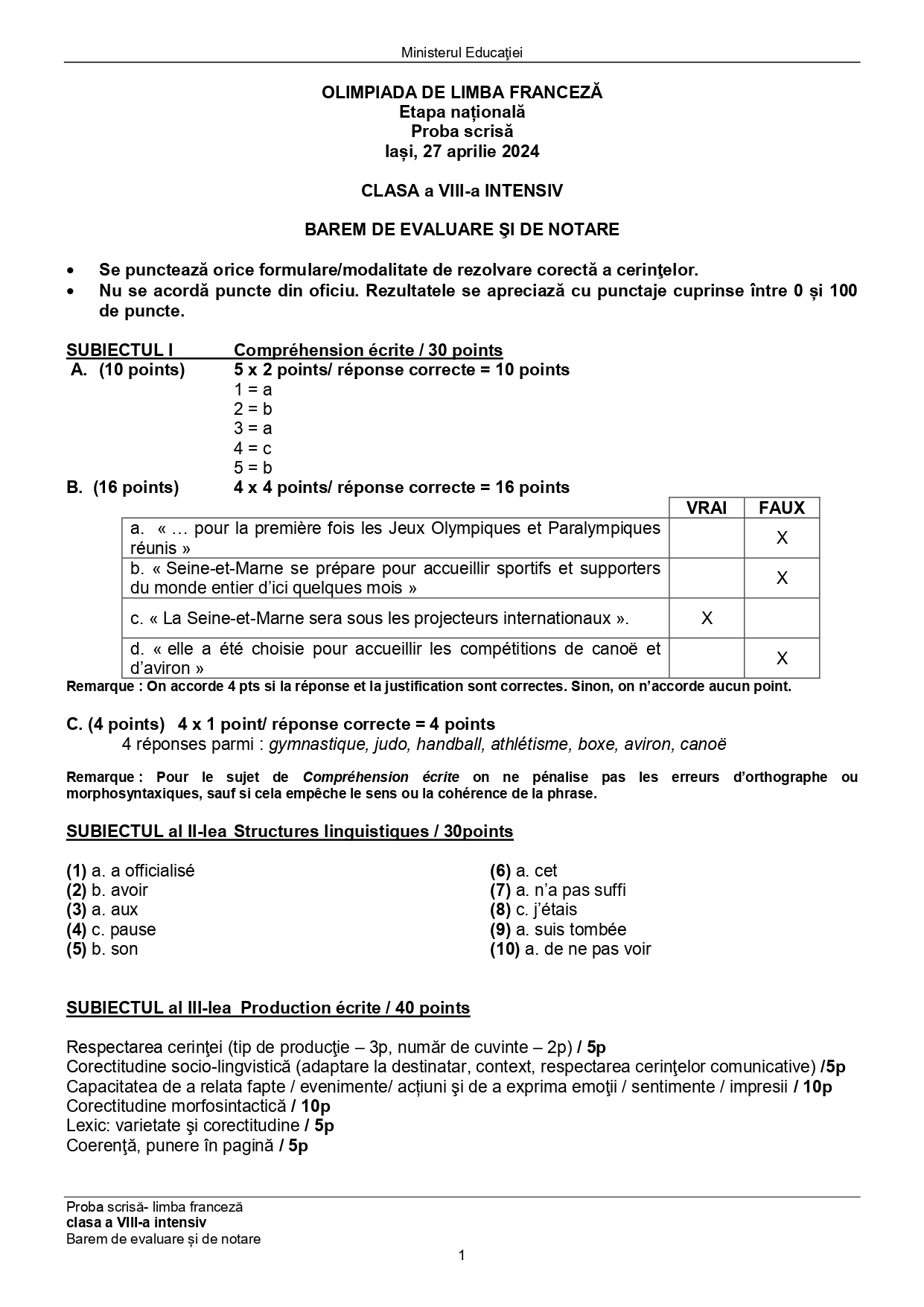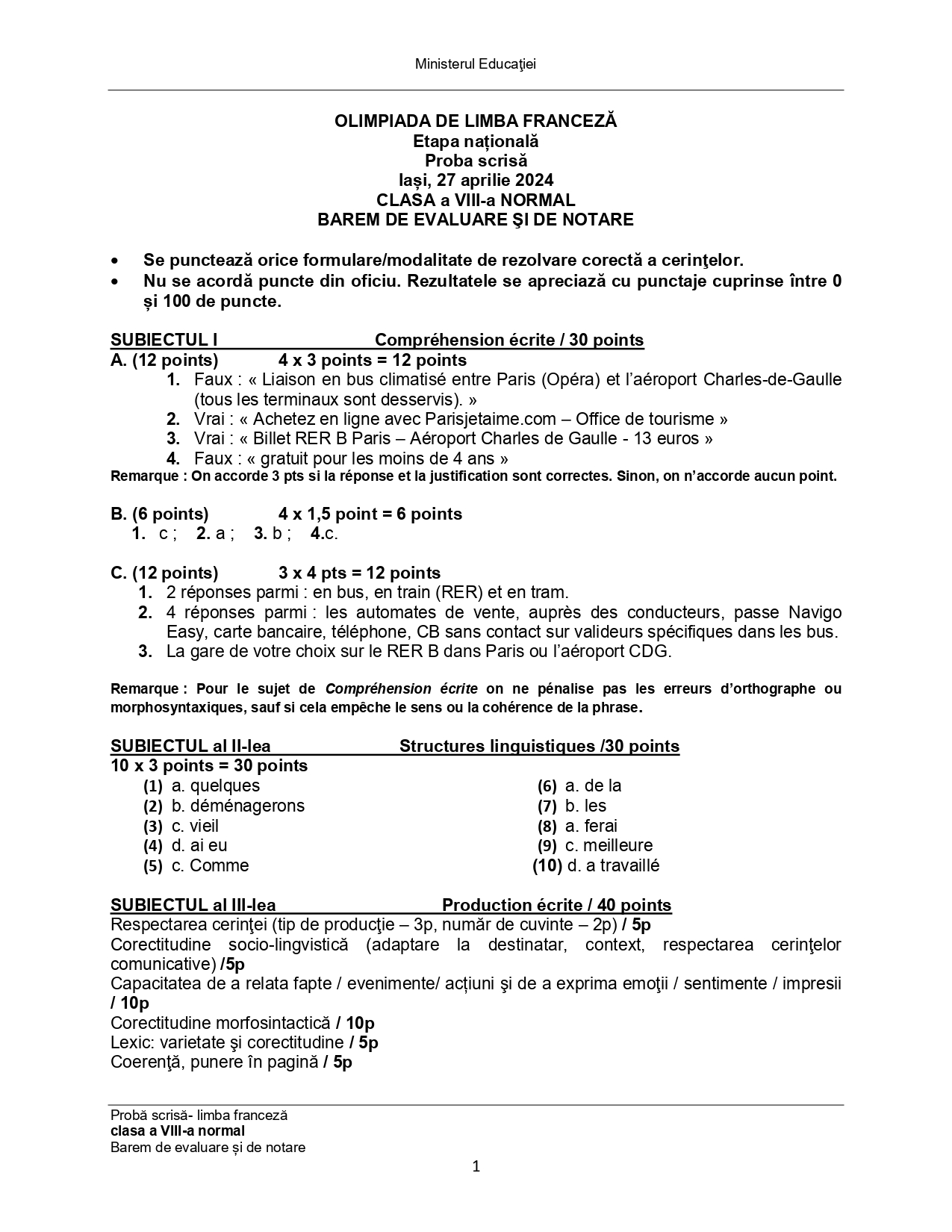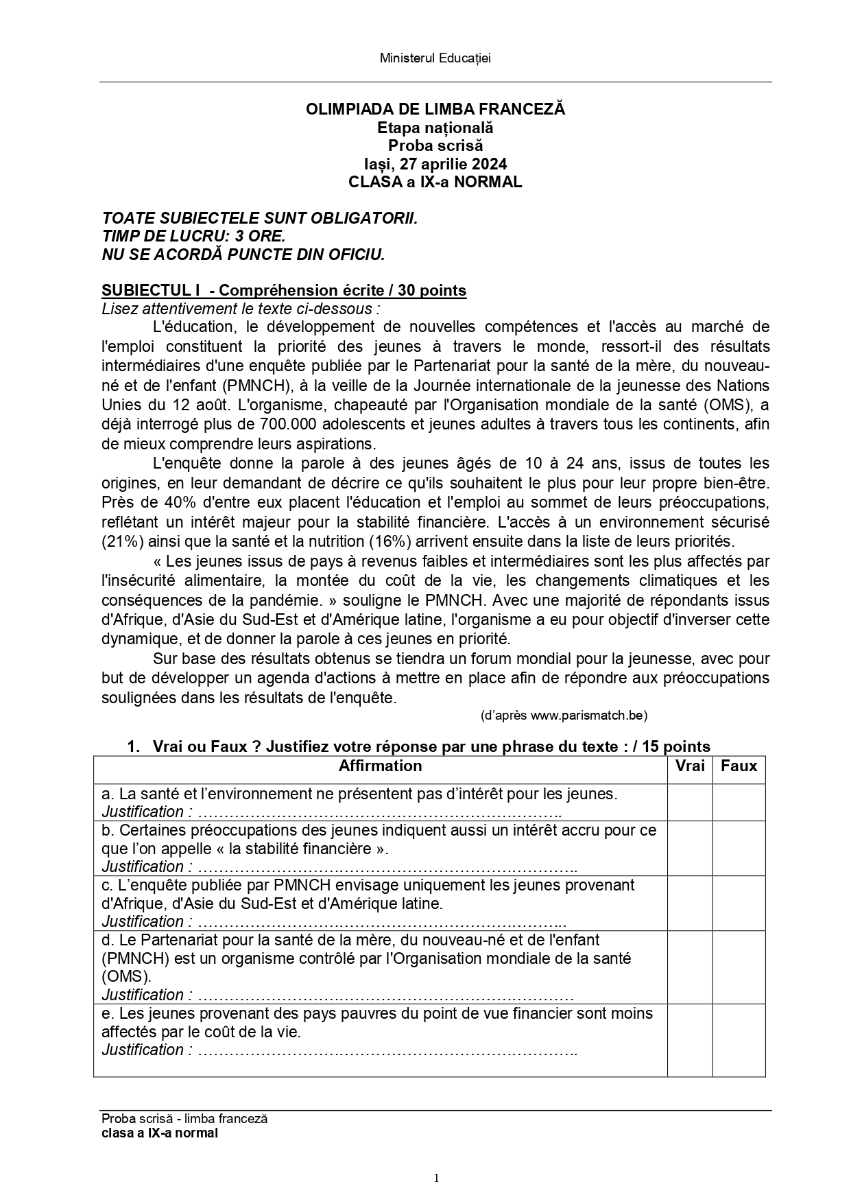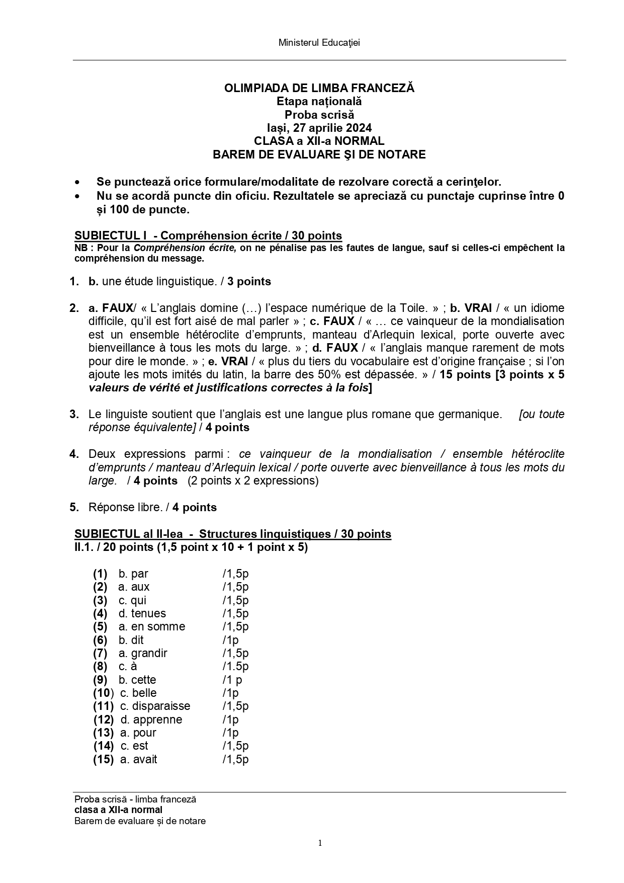 Subiectele și baremele de la Olimpiada Națională de Limba franceză (ONLF) 2024 de la Iași au fost publicate de organizatori sâmbătă seară, 27 aprilie, după probe. Documentele, pentru fiecare din cele două regimuri de studiu ale limbii – normal (N) sau intensiv/bilingv (B) pot fi descărcate mai jos din articol.