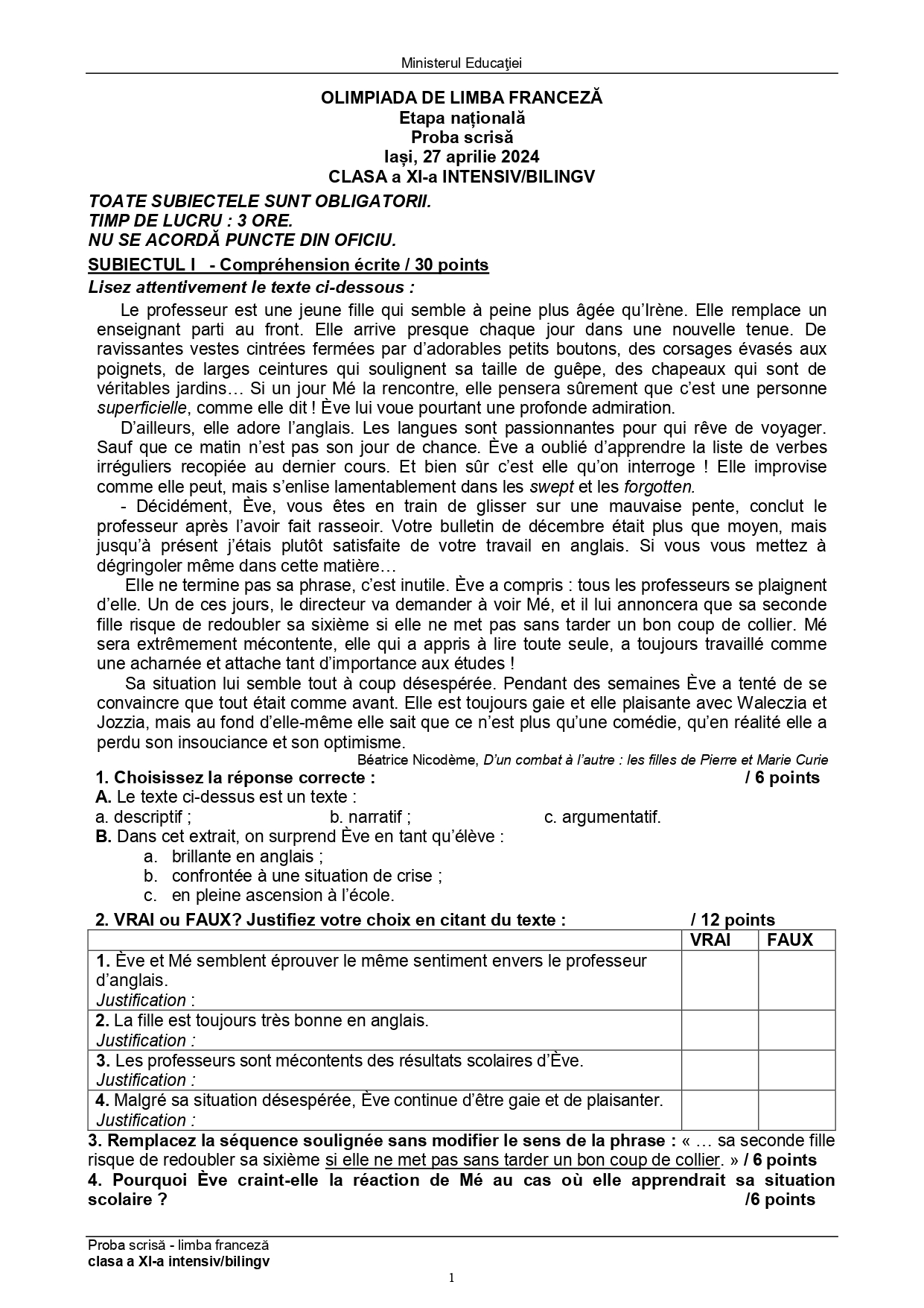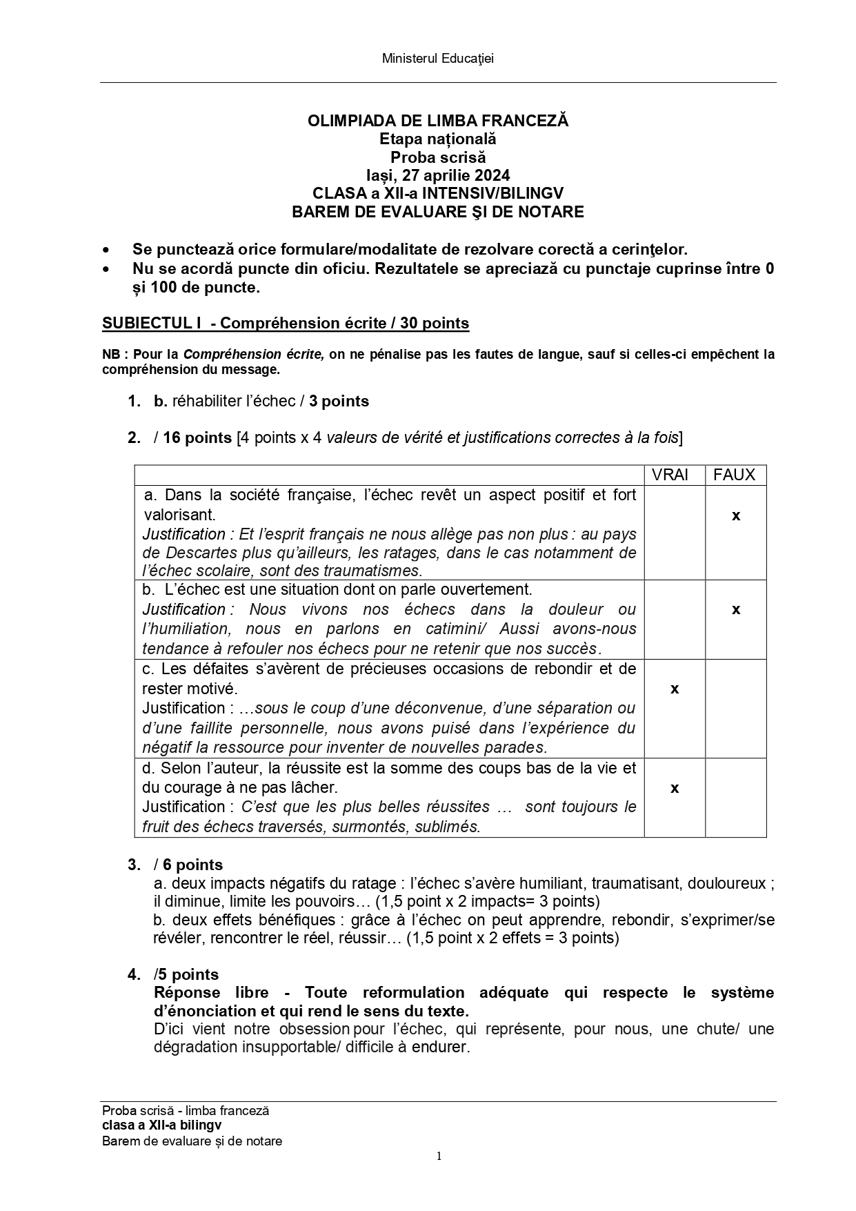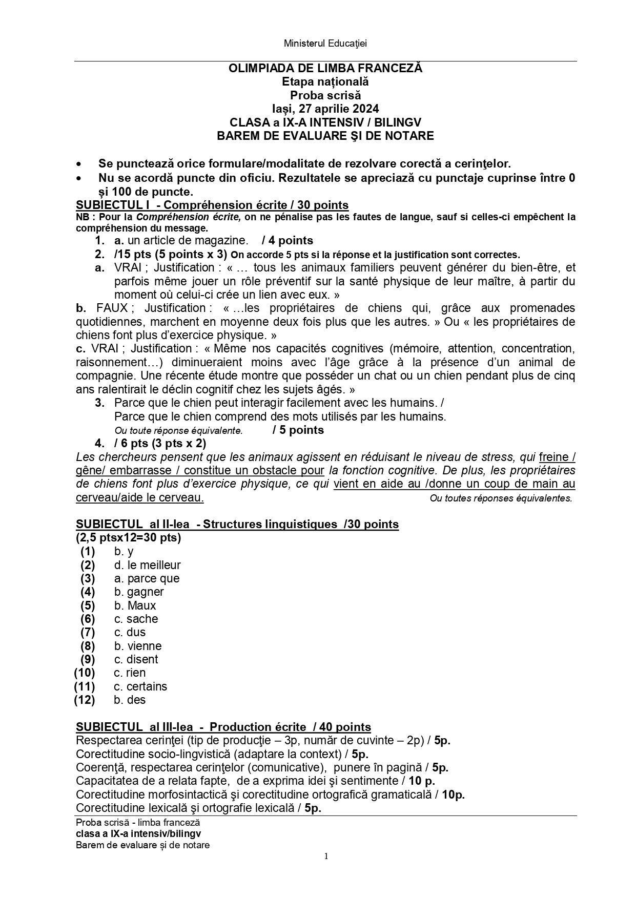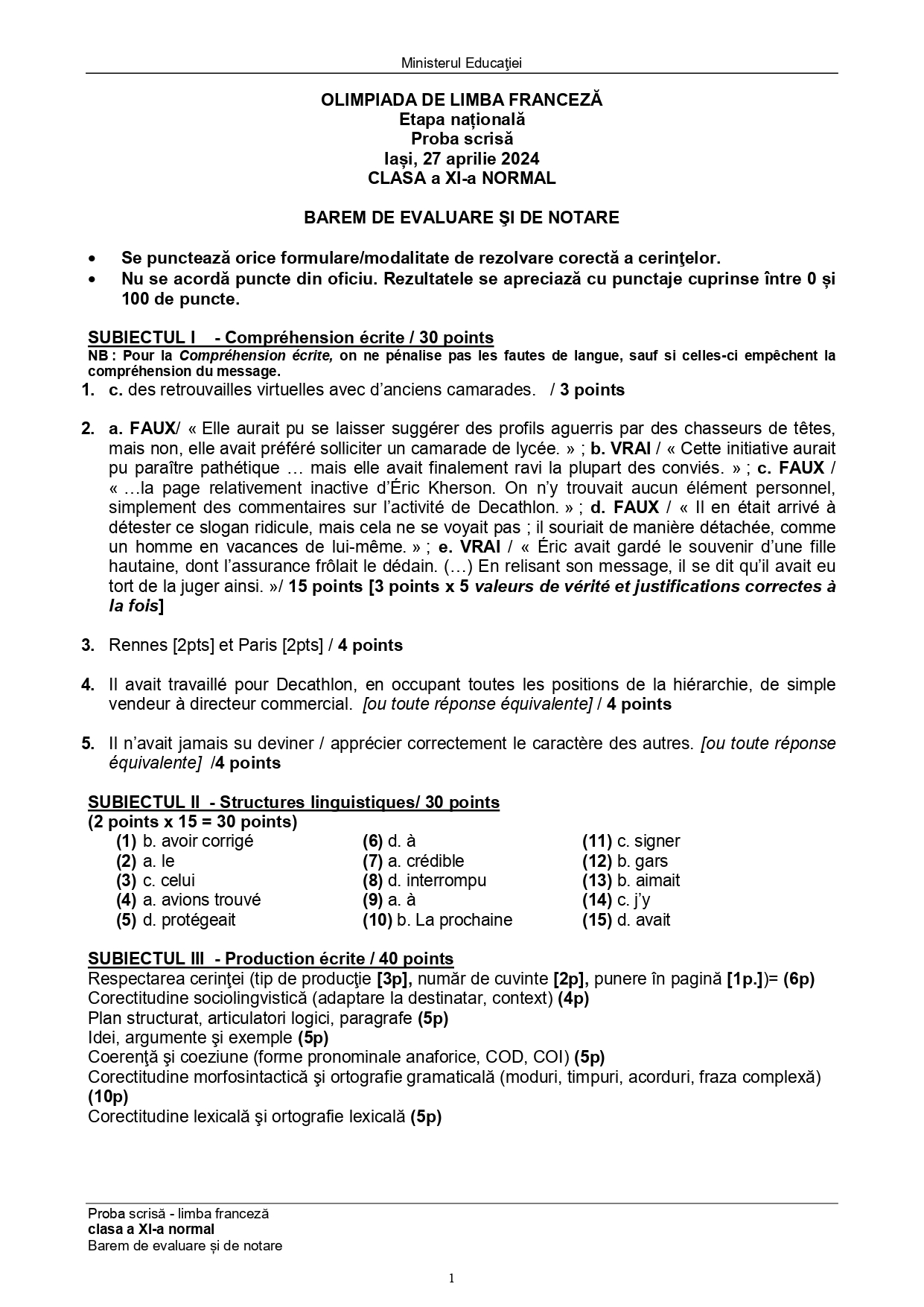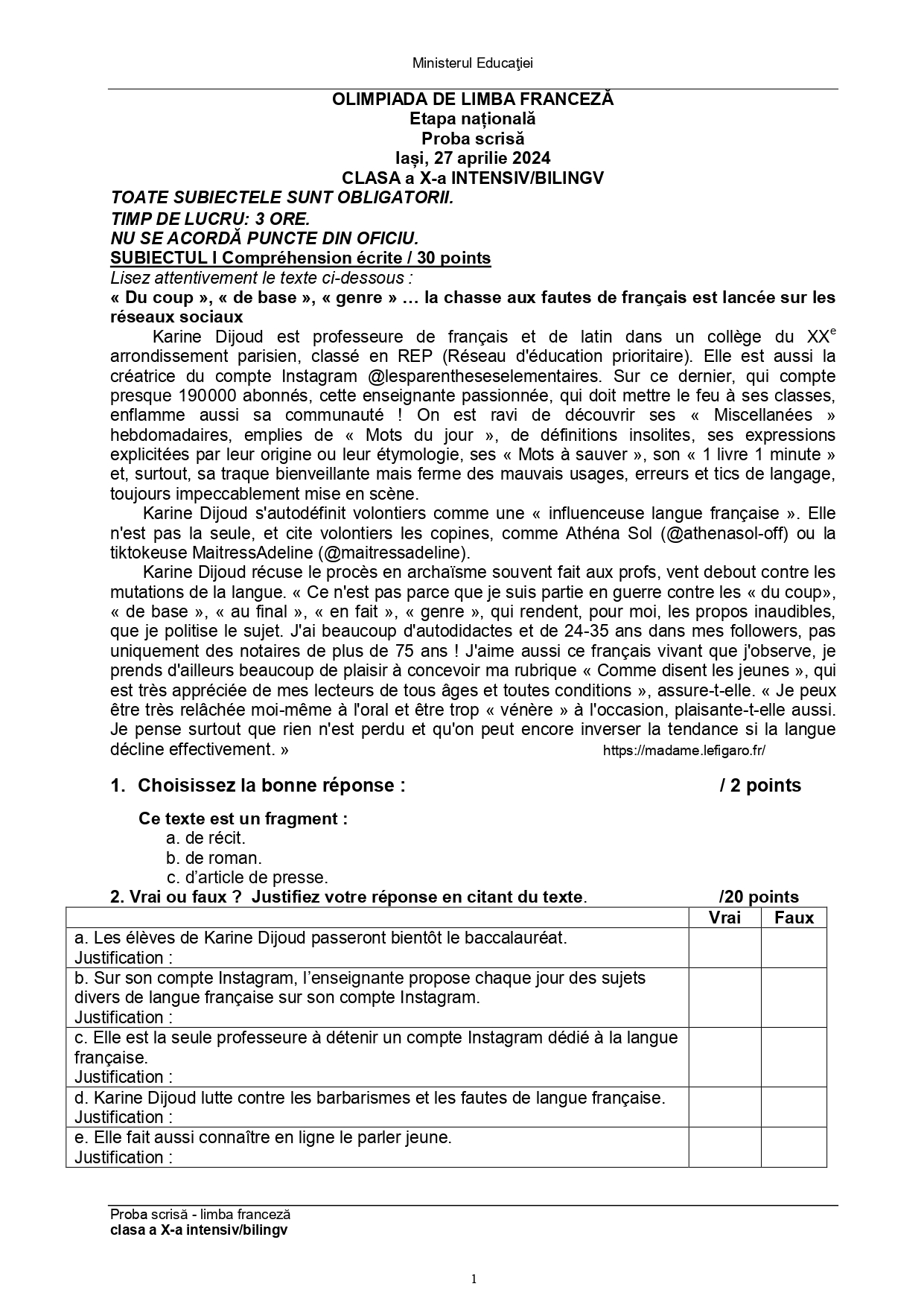 Subiectele și baremele de la Olimpiada Națională de Limba franceză (ONLF) 2024 de la Iași au fost publicate de organizatori sâmbătă seară, 27 aprilie, după probe. Documentele, pentru fiecare din cele două regimuri de studiu ale limbii – normal (N) sau intensiv/bilingv (B) pot fi descărcate mai jos din articol.