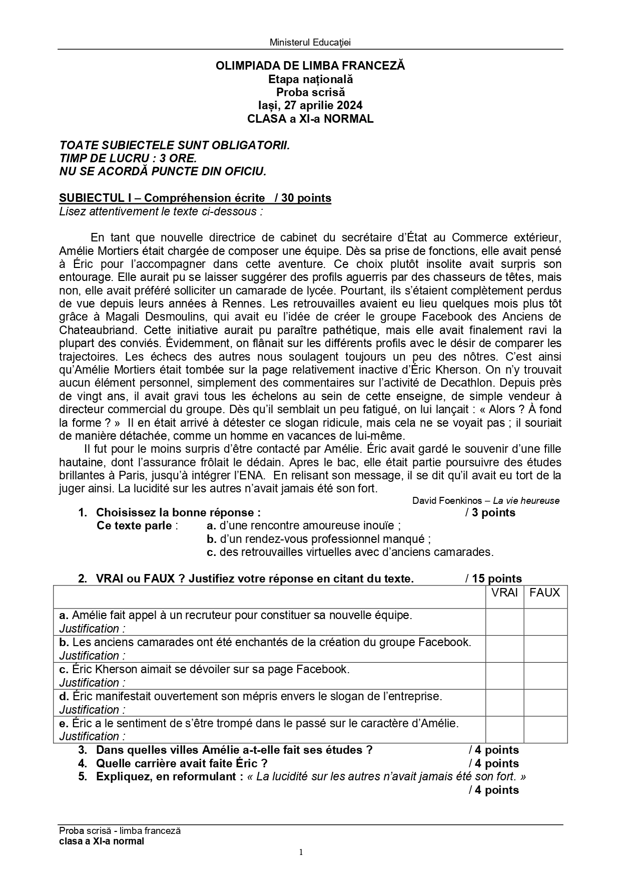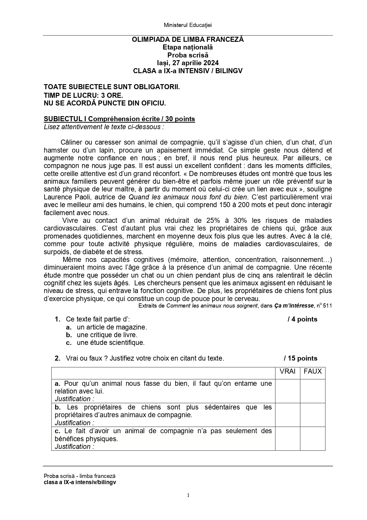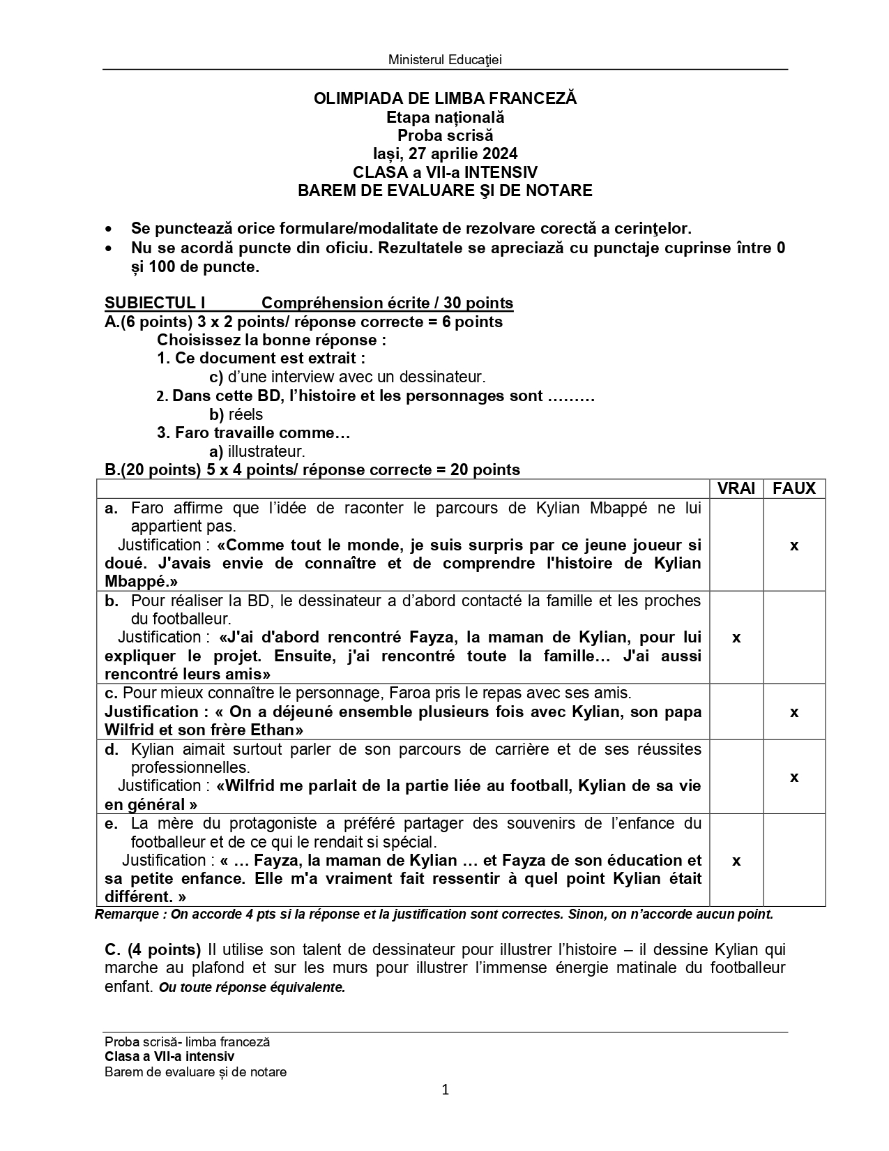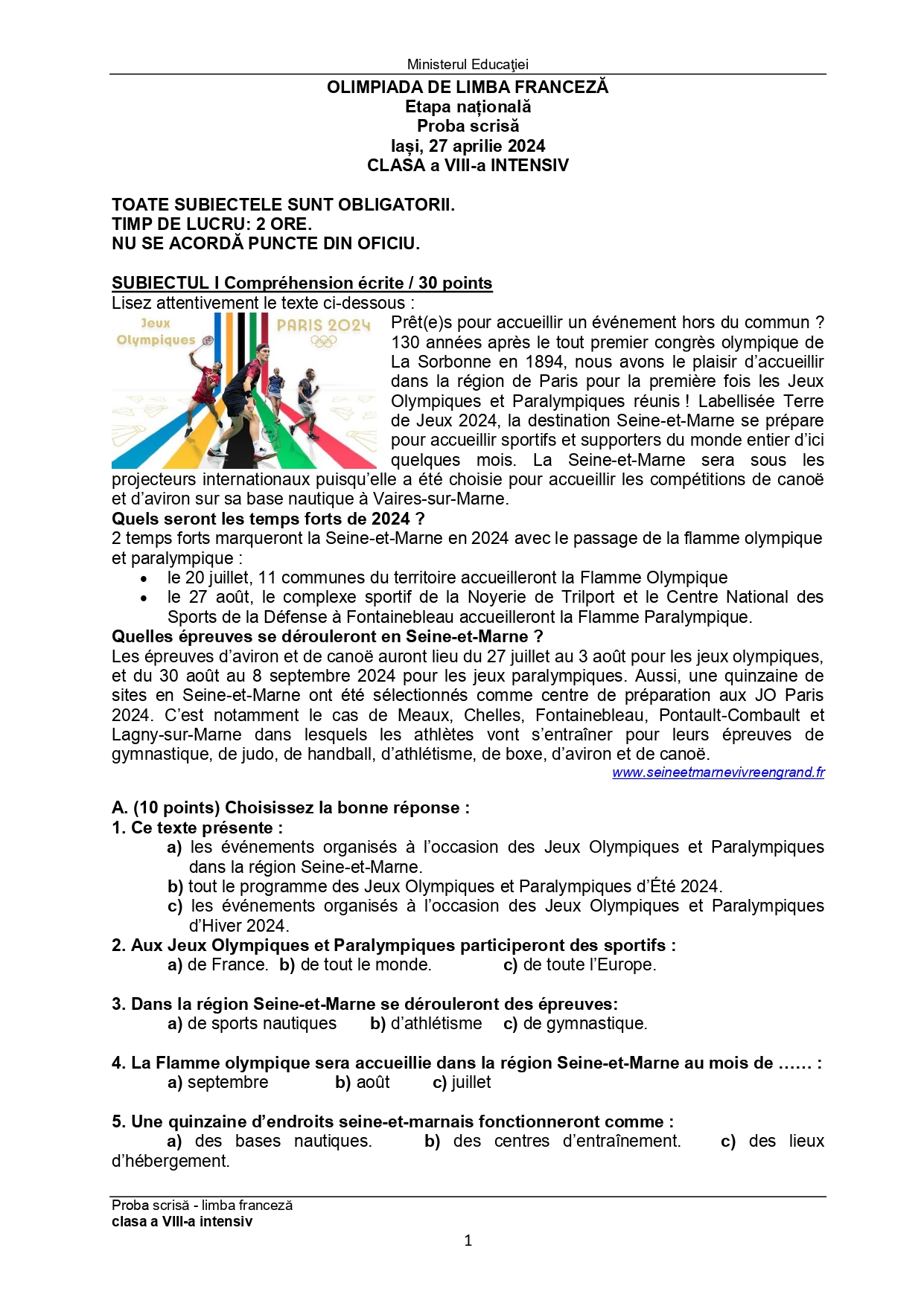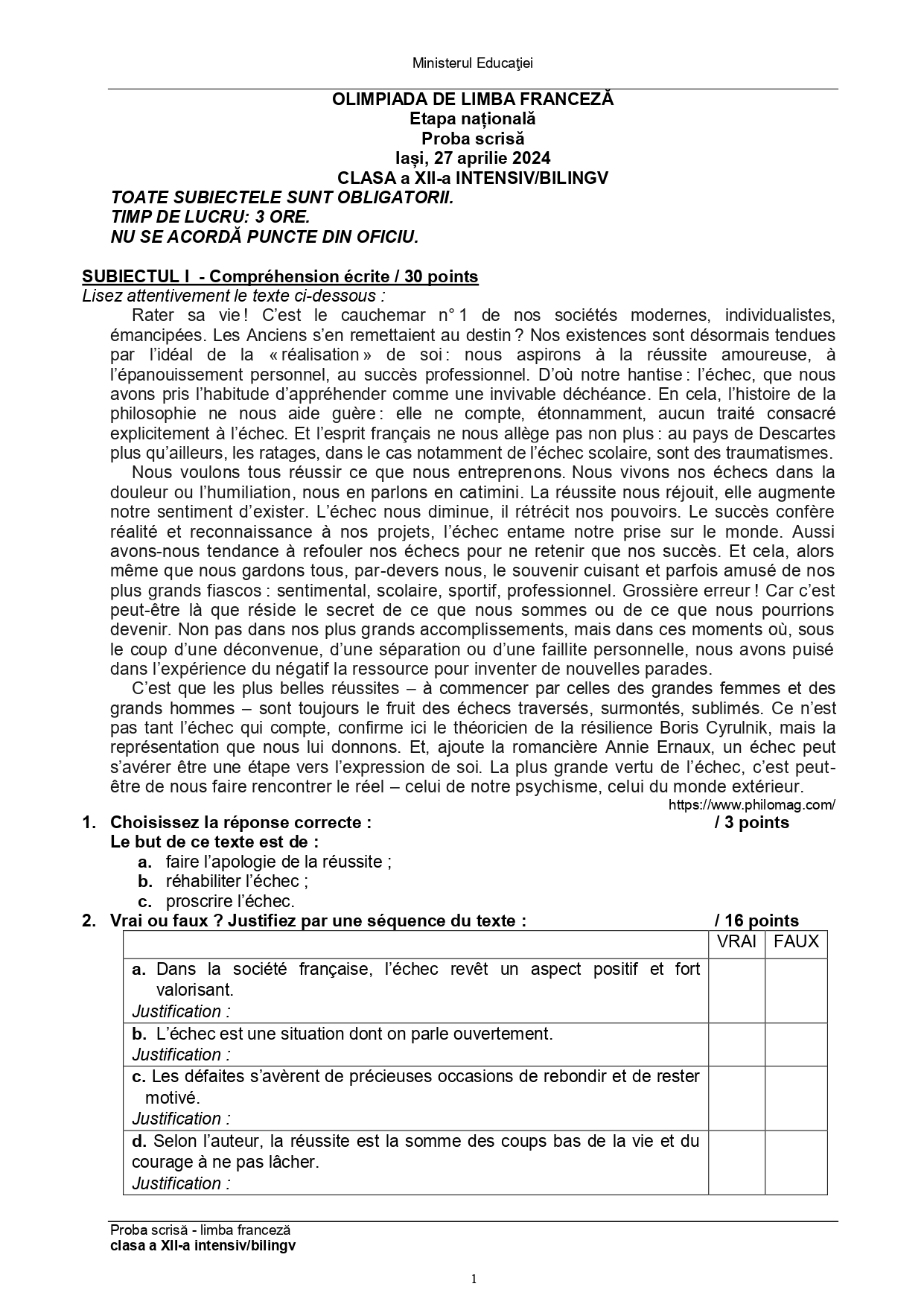 Subiectele și baremele de la Olimpiada Națională de Limba franceză (ONLF) 2024 de la Iași au fost publicate de organizatori sâmbătă seară, 27 aprilie, după probe. Documentele, pentru fiecare din cele două regimuri de studiu ale limbii – normal (N) sau intensiv/bilingv (B) pot fi descărcate mai jos din articol.