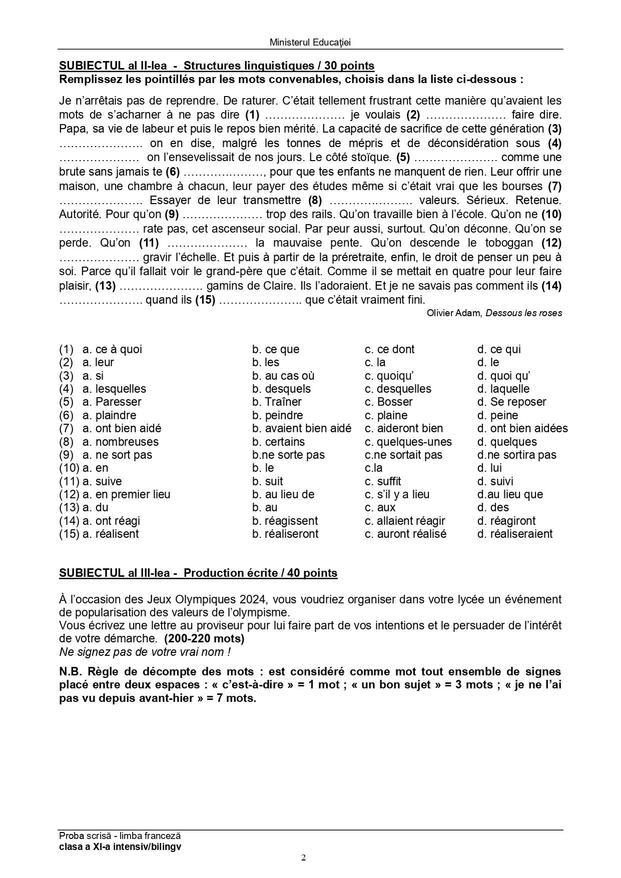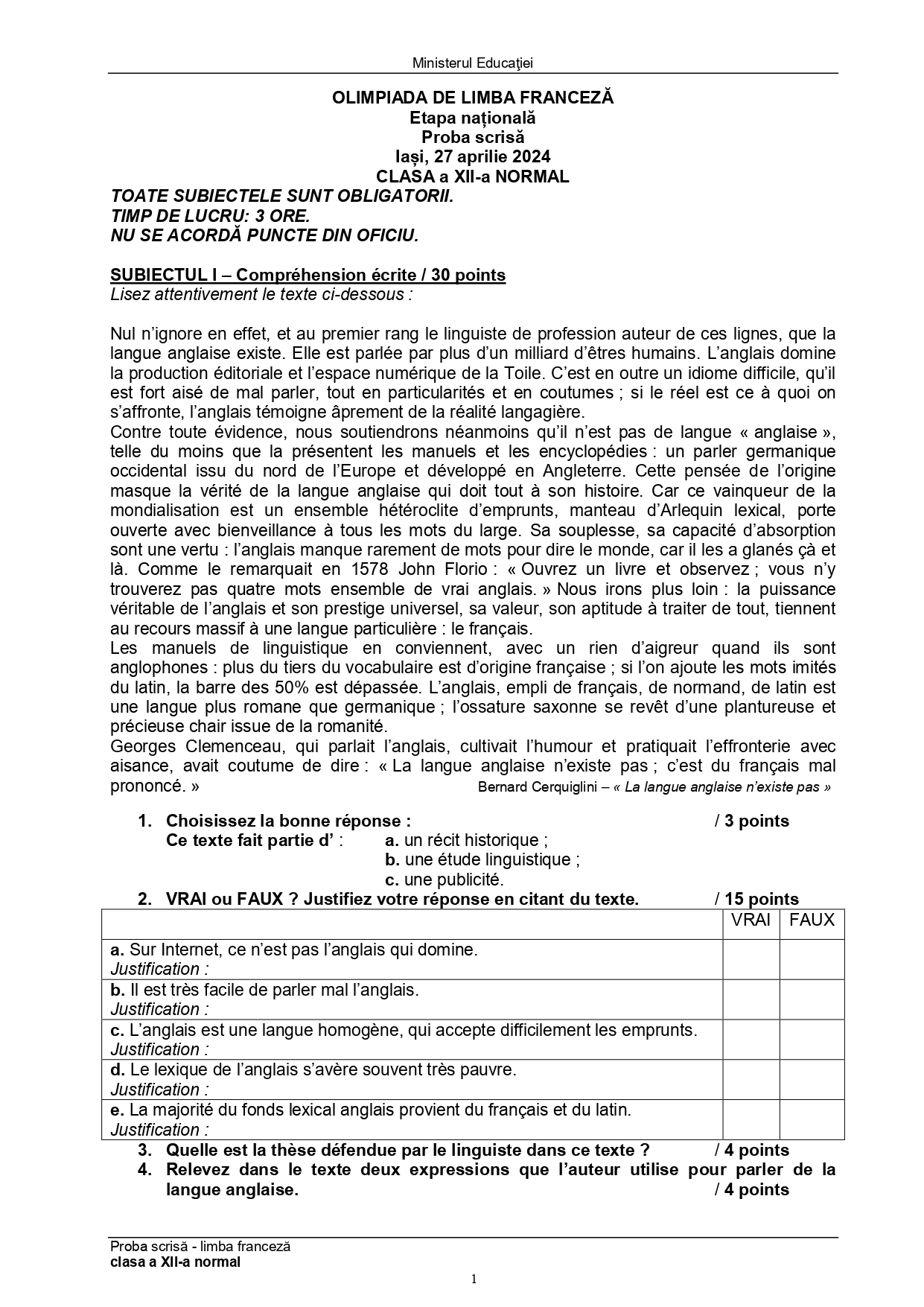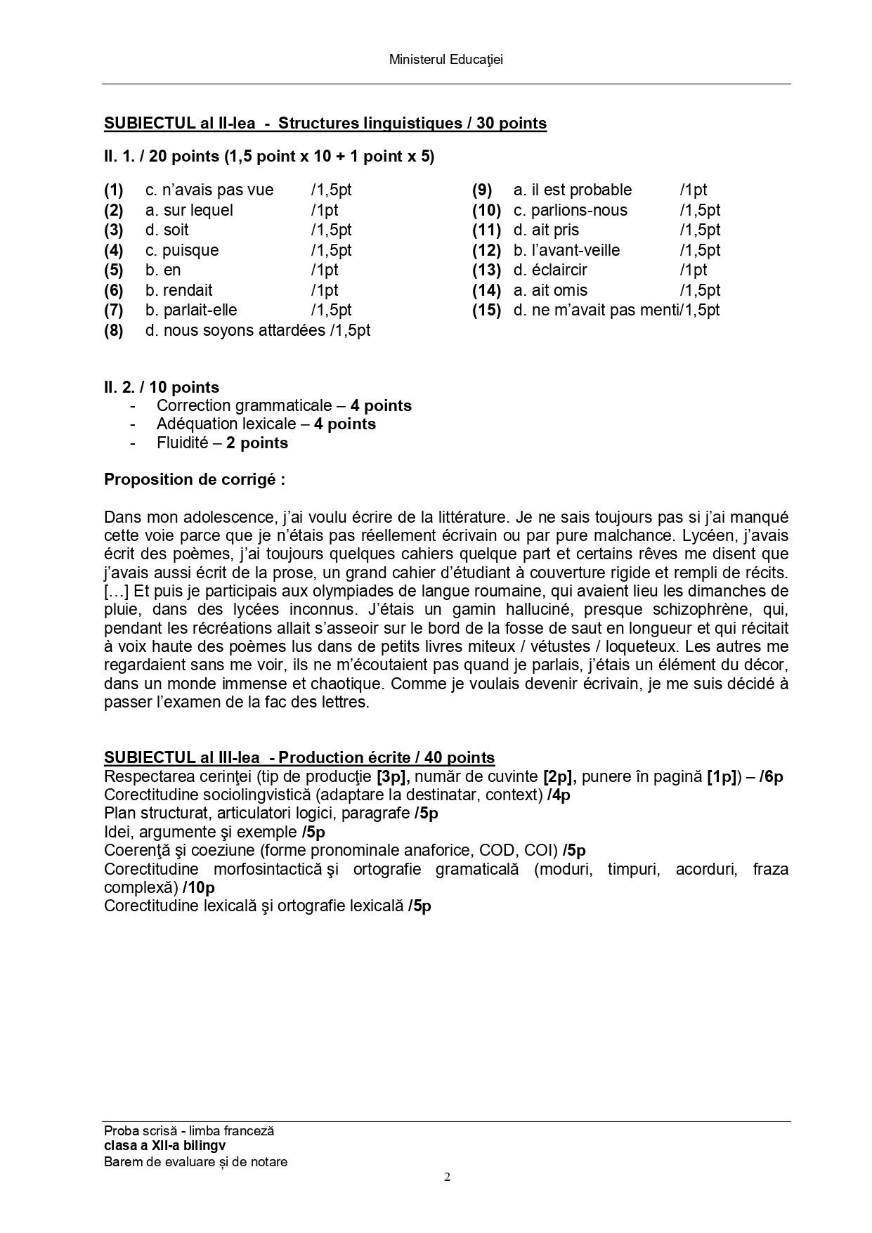 Subiect – clasa a XI-a Bilingv: